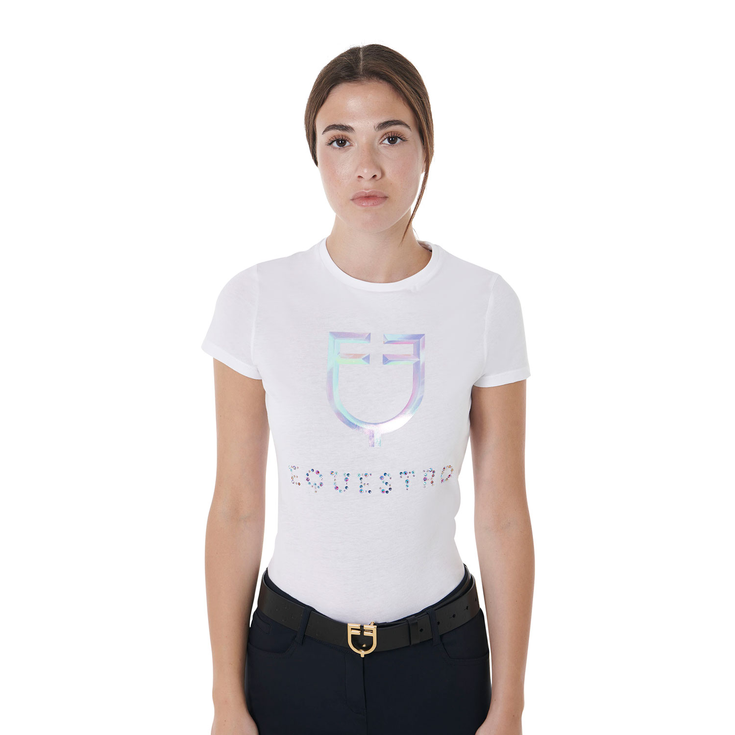 T-shirt da donna a manica corta realizzata in morbido cotone, progettata per aderire delicatamente alla silhouette femminile grazie alla sua vestibilità slim fit.