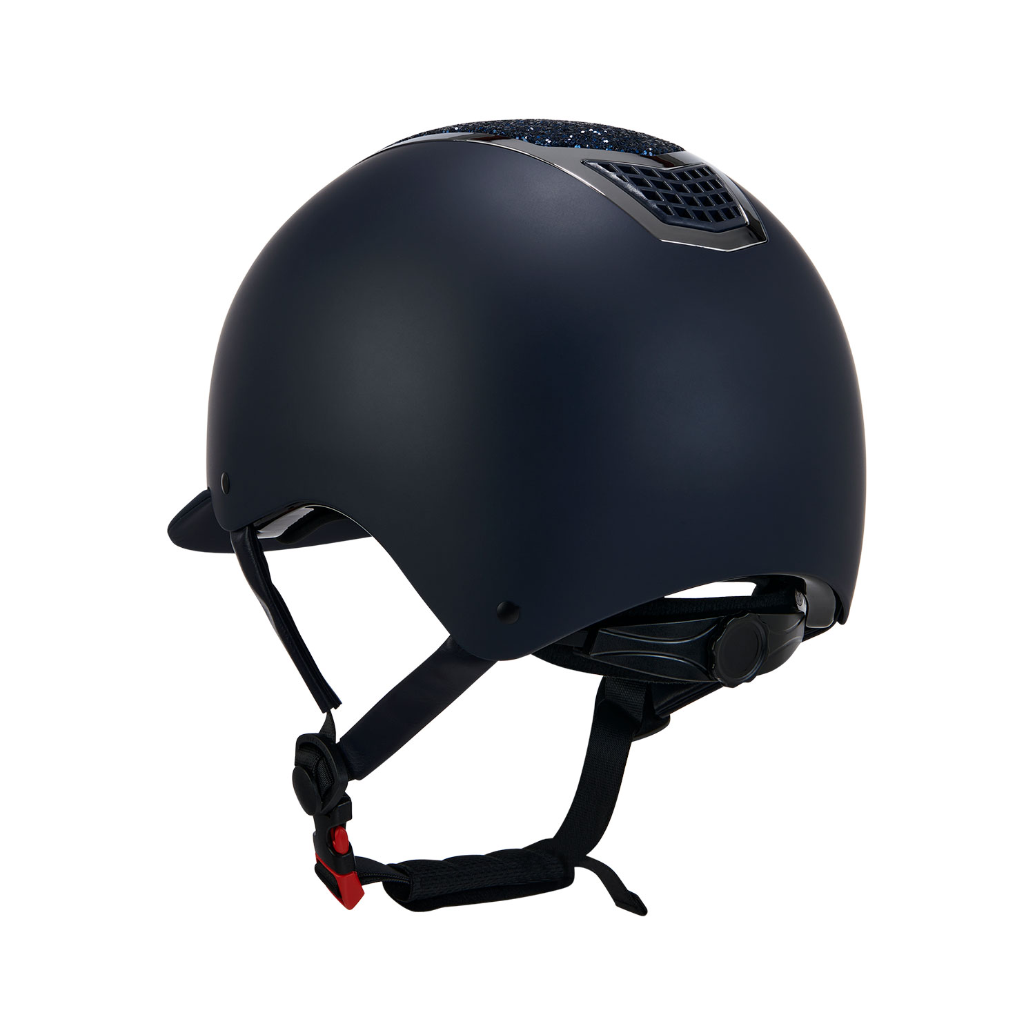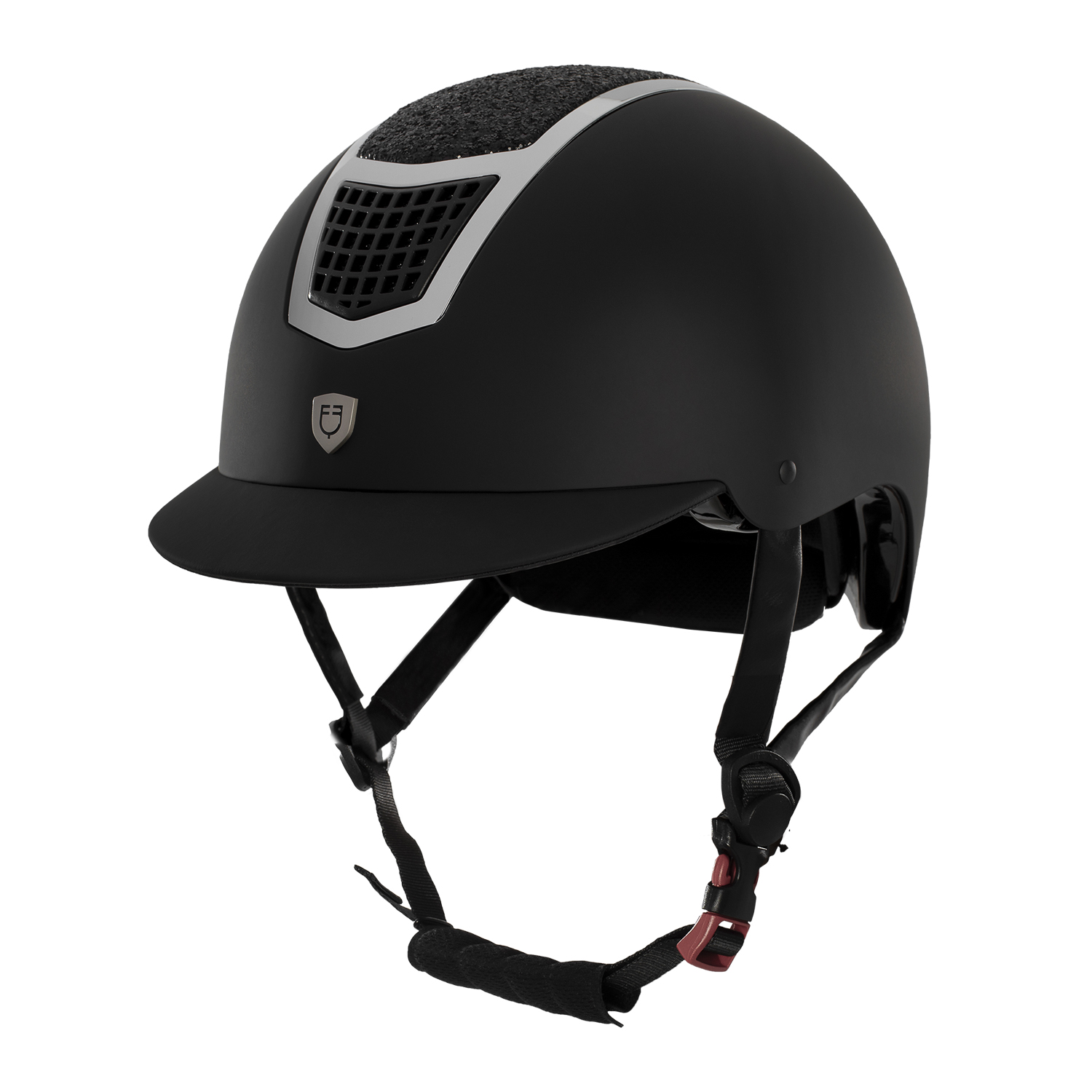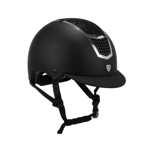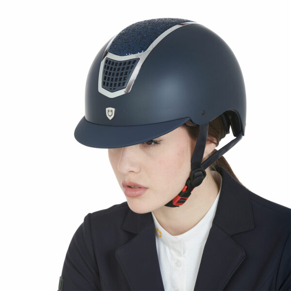 La calotta esterna è opaca e impreziosita dall’applicazione di brillantini tono su tono e targhetta con logo Equestro.