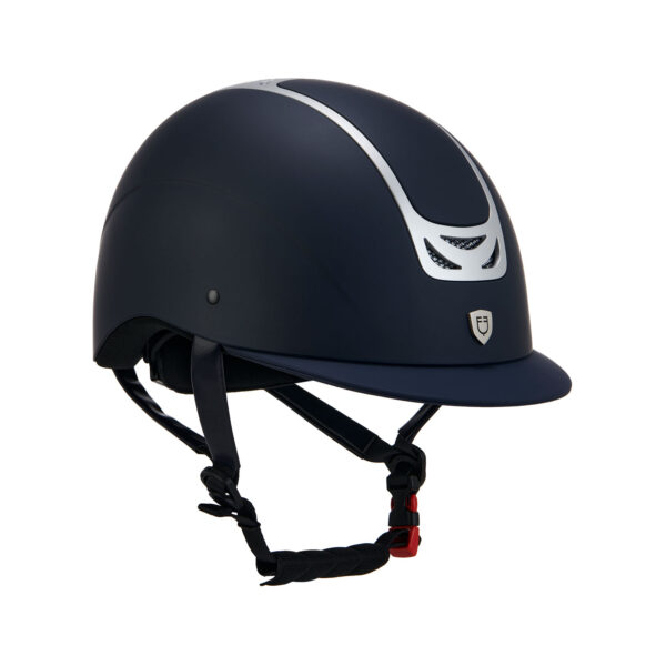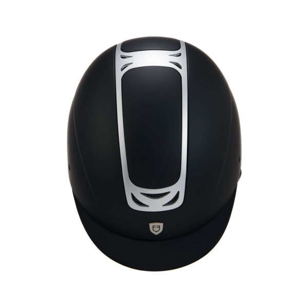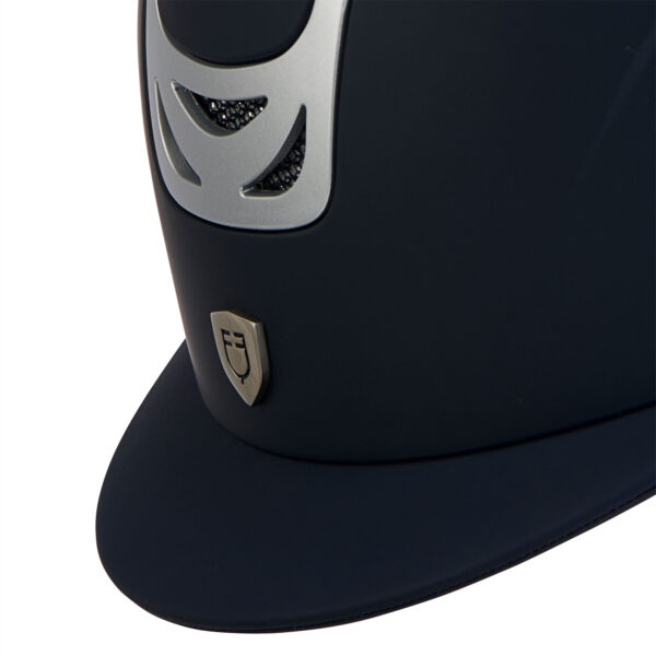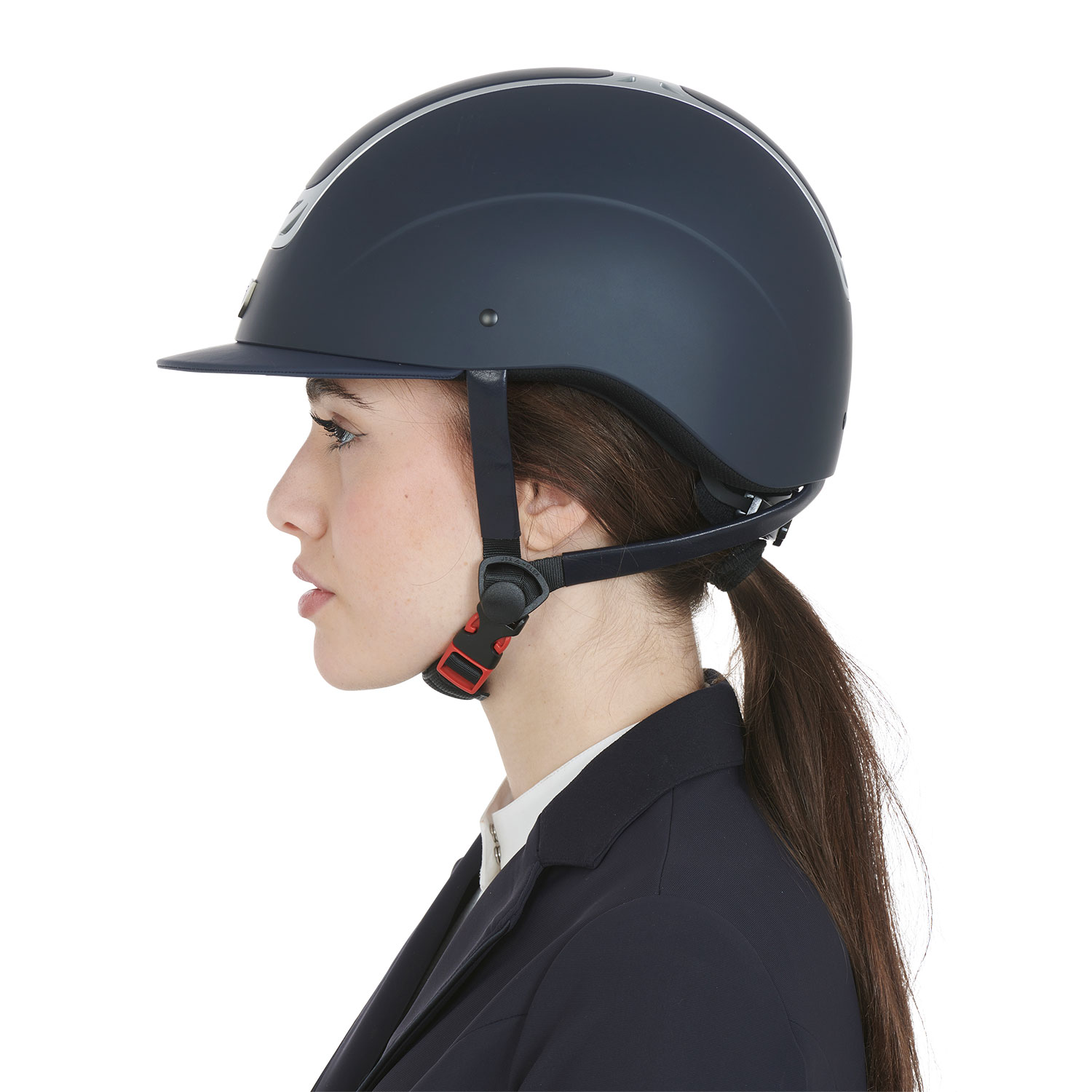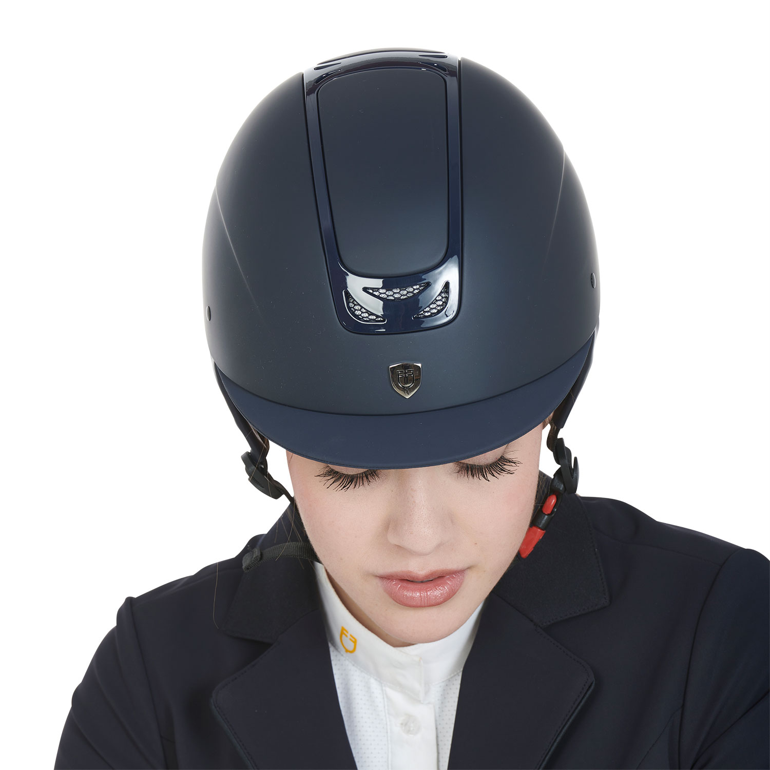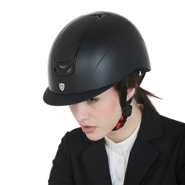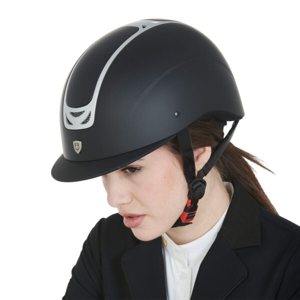 La calotta esterna è opaca con prese d’aria frontali decorate con profili argento e targhetta con logo Equestro.