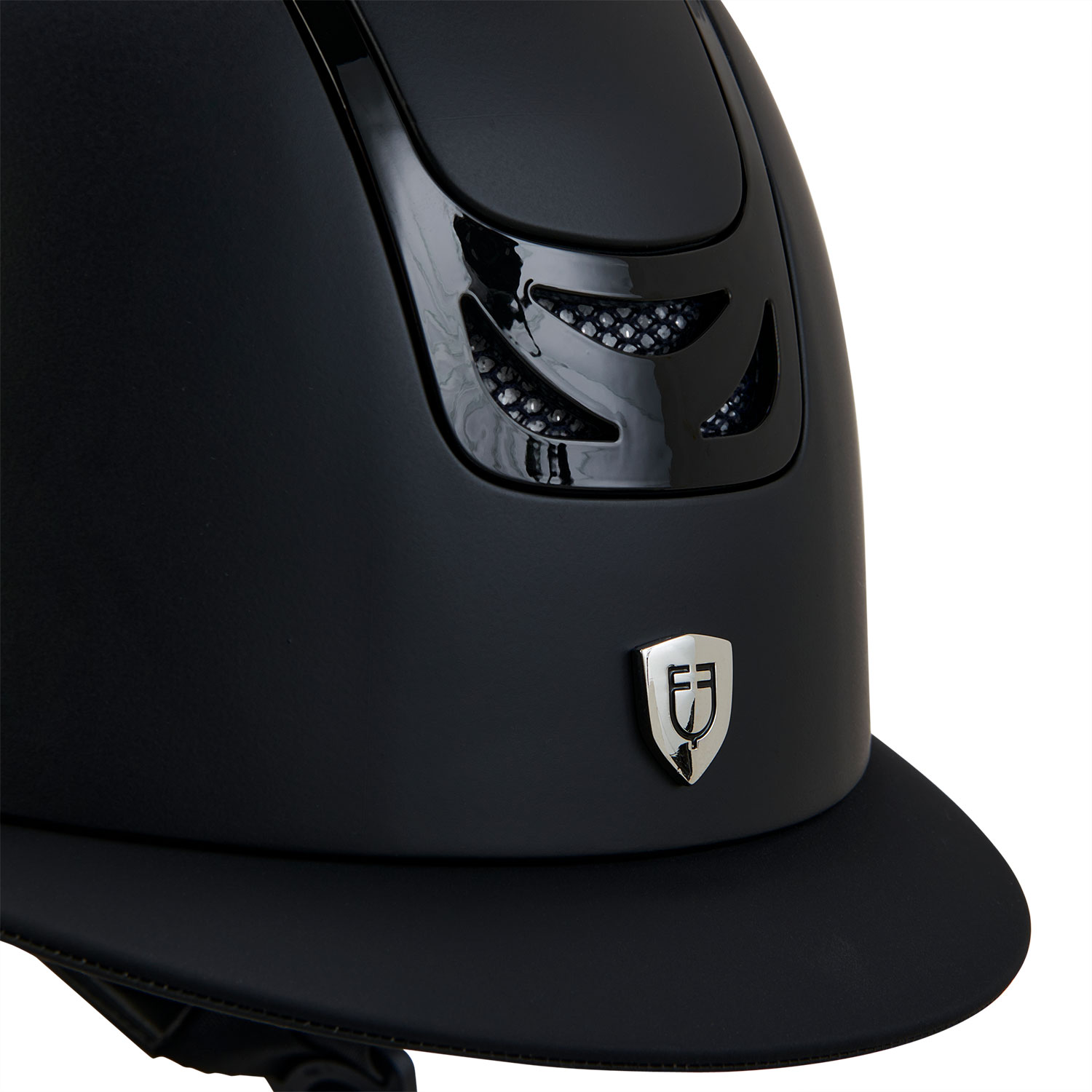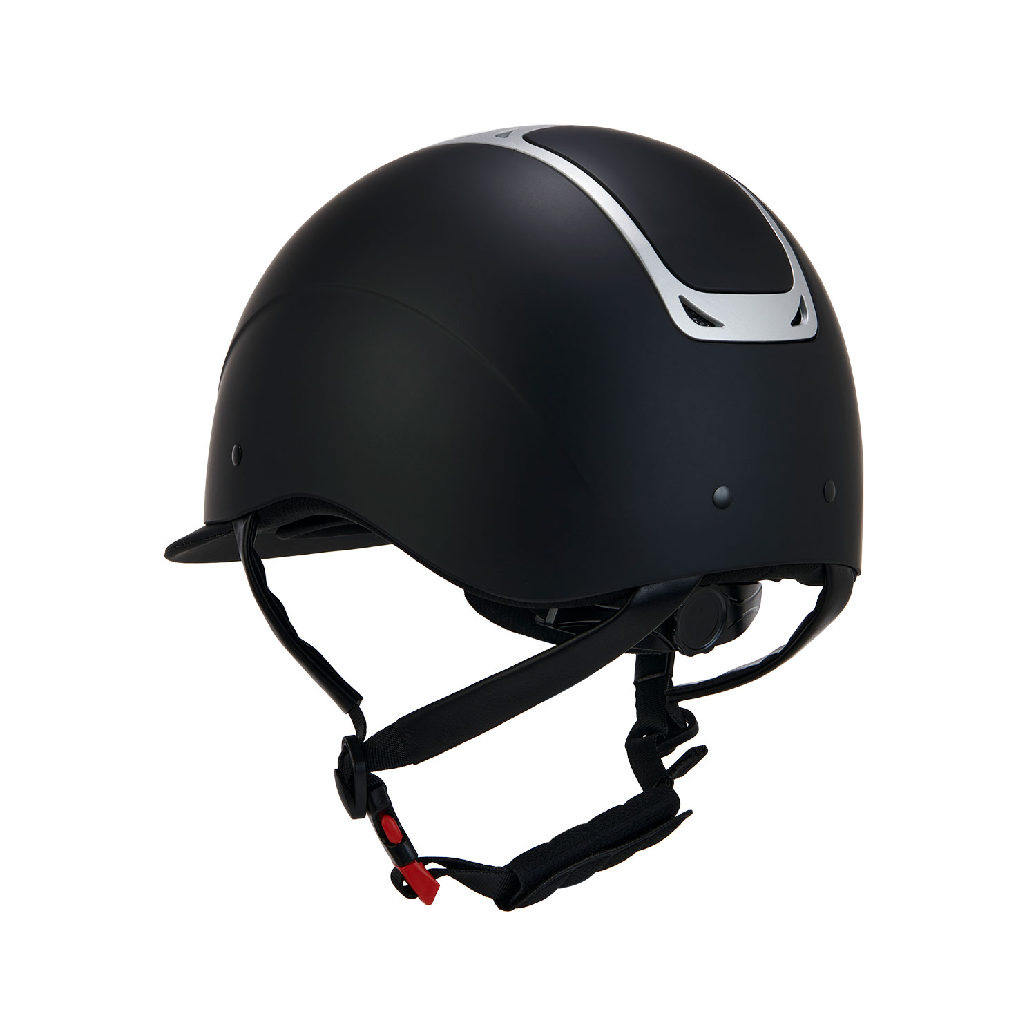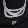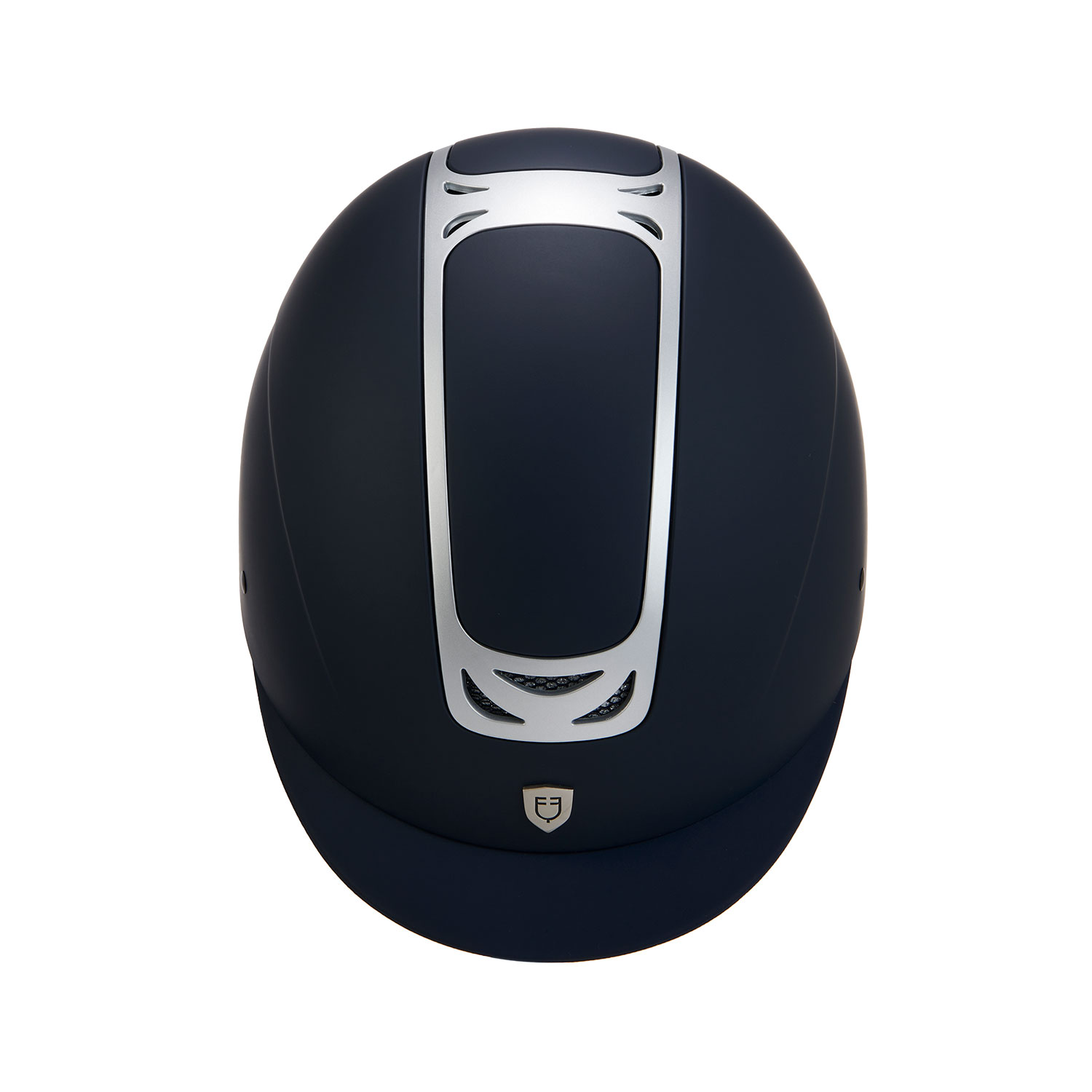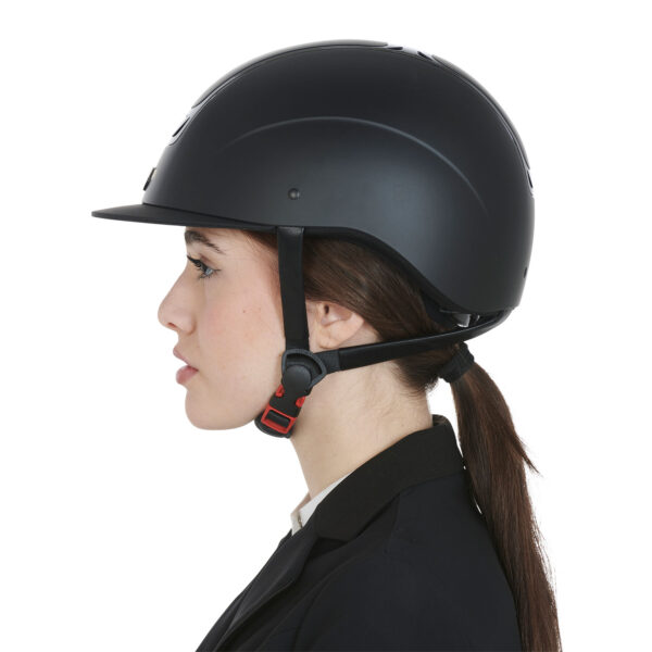 La calotta esterna è opaca con prese d’aria frontali decorate con profili argento e targhetta con logo Equestro.