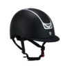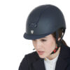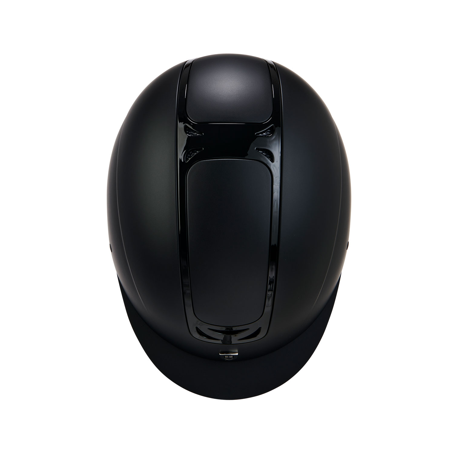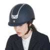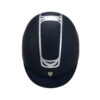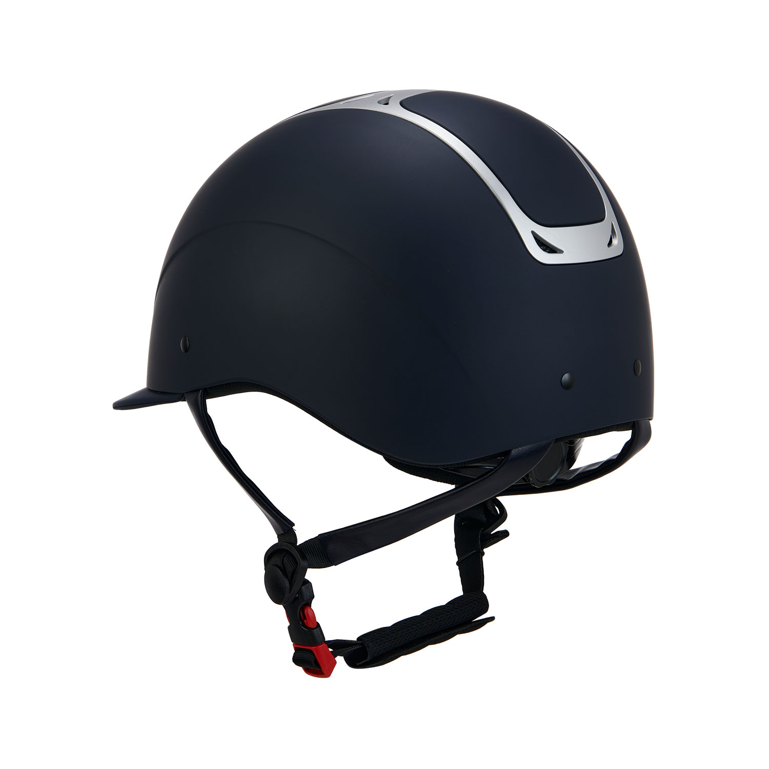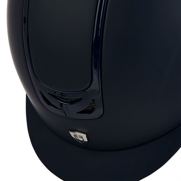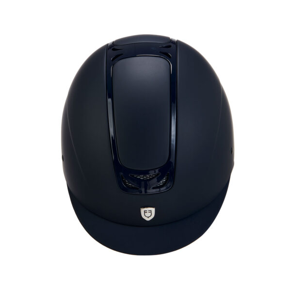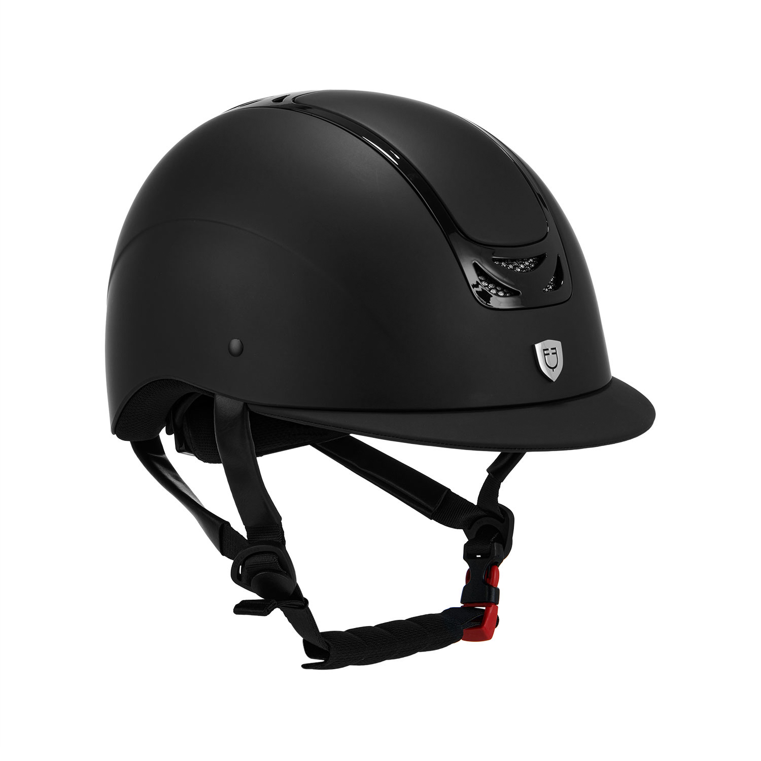 La calotta esterna è opaca con prese d’aria frontali decorate con profili argento e targhetta con logo Equestro.