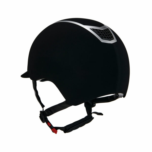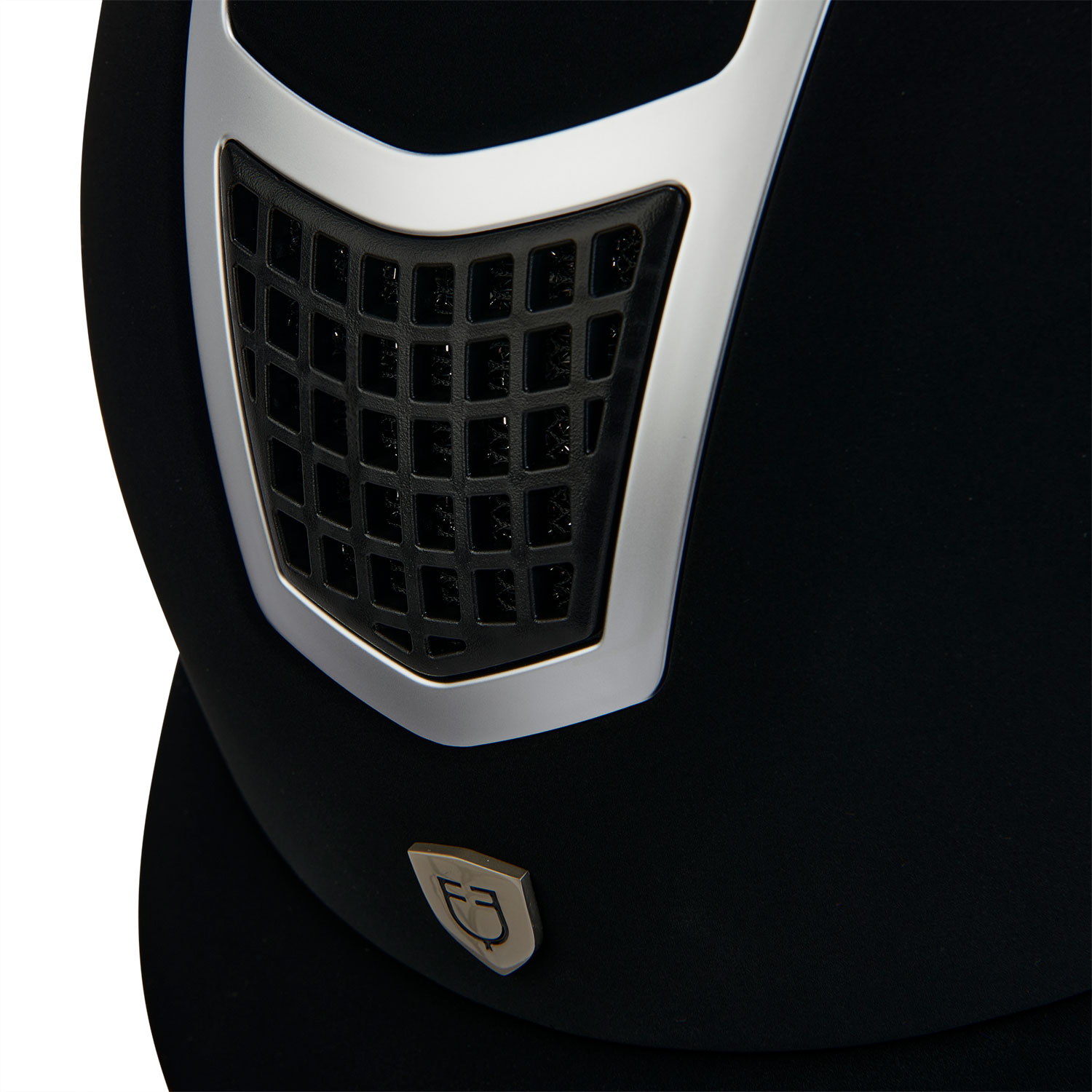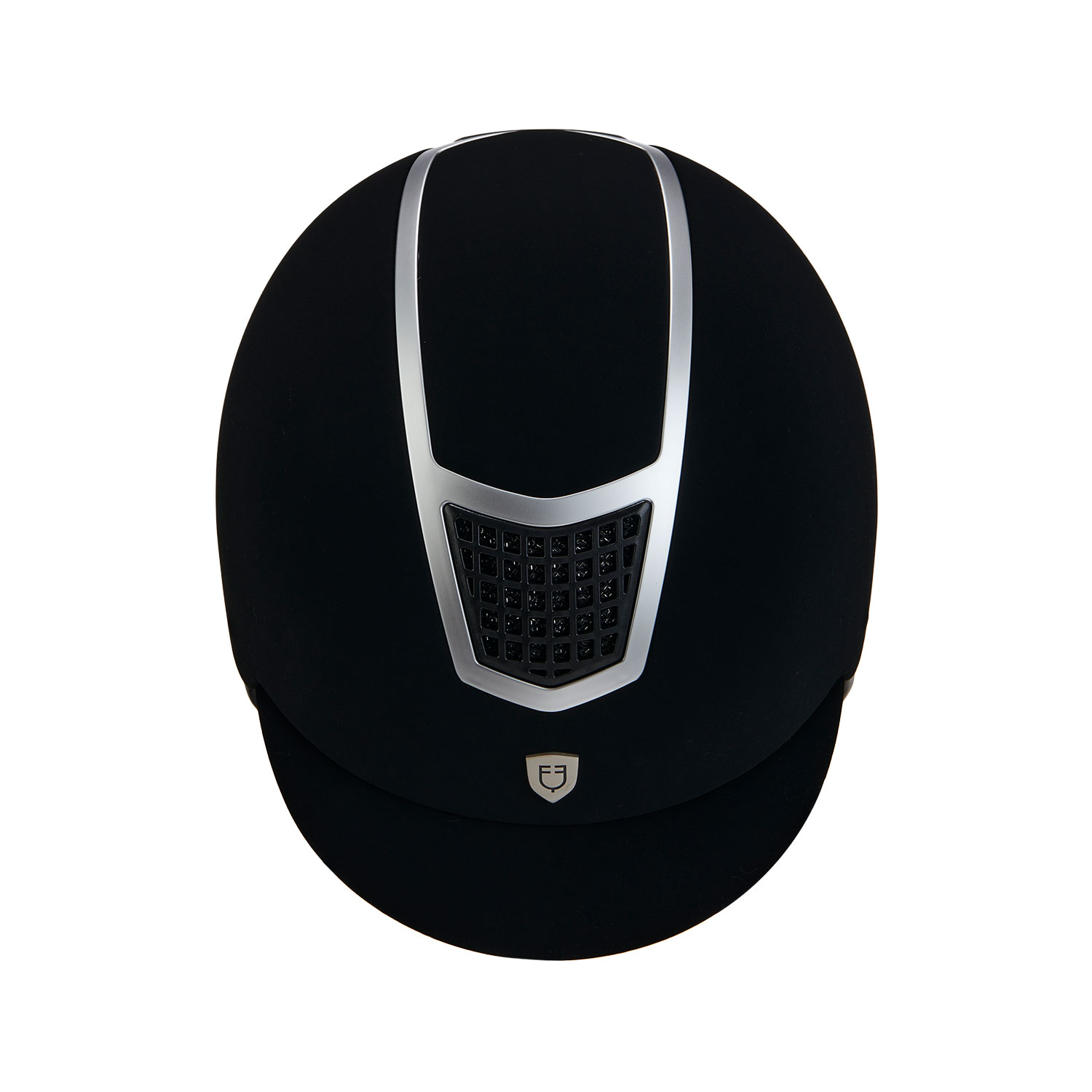 La calotta esterna è in velluto con prese d’aria frontali decorate da profili di vario colore e targhetta con logo Equestro.