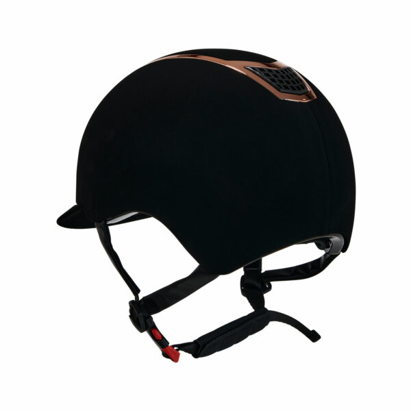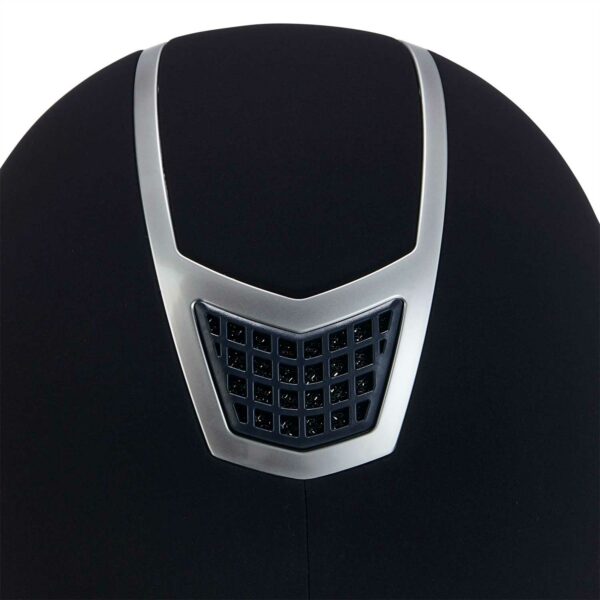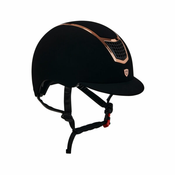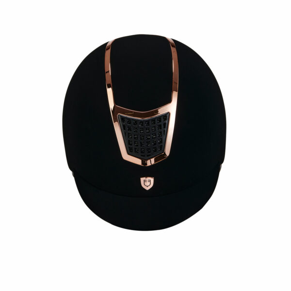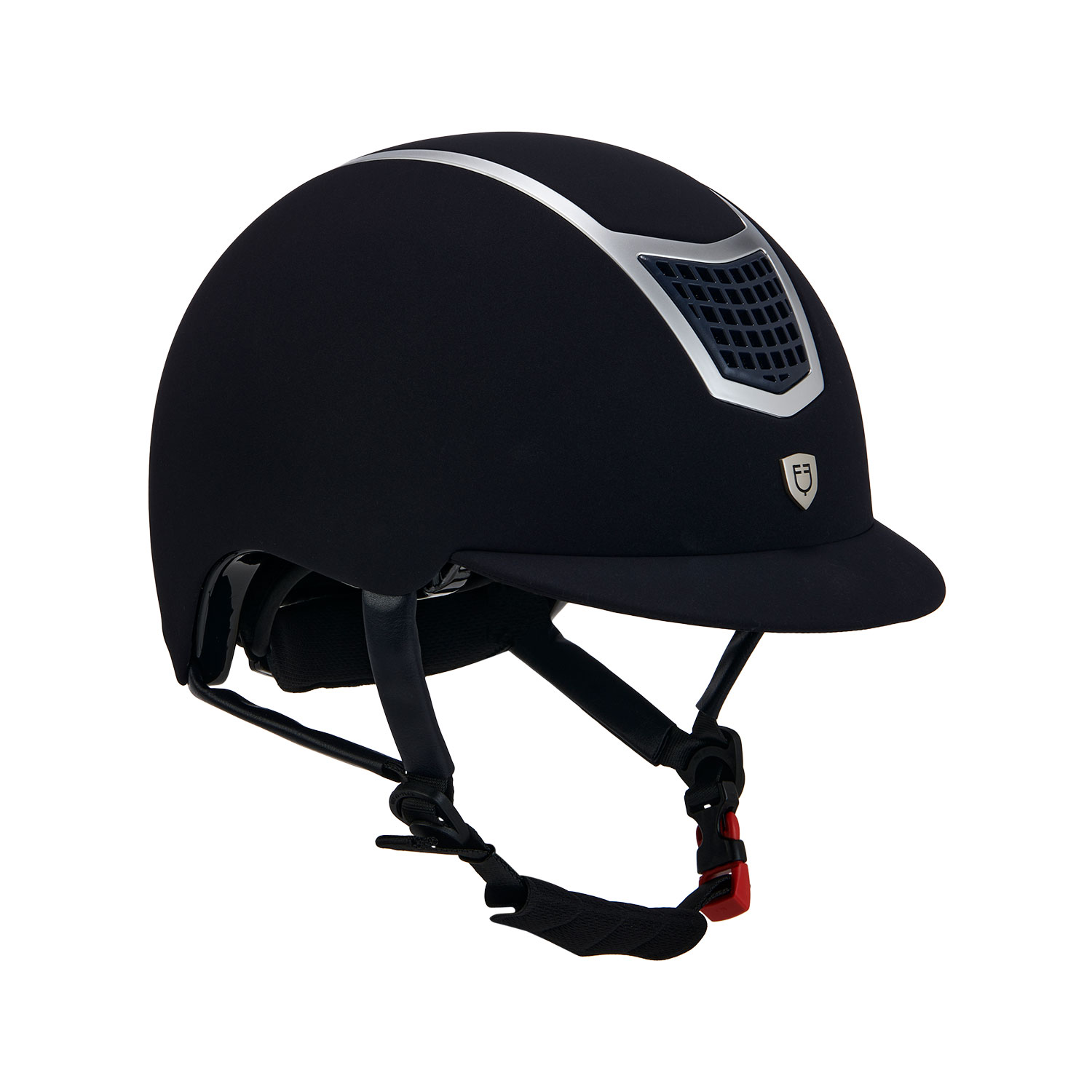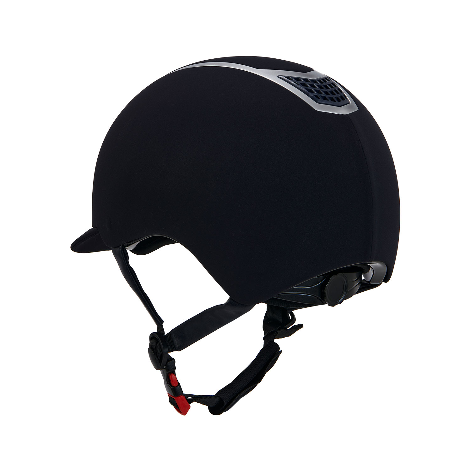 La calotta esterna è in velluto con prese d’aria frontali decorate da profili di vario colore e targhetta con logo Equestro.