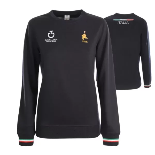 Felpa da equitazione per donna Cavalleria Toscana x FISE a girocollo. Questa felpa grazie al girocollo garantisce il massimo comfort e vestibilità, perfetta per essere indossata tutti i giorni in scuderia.