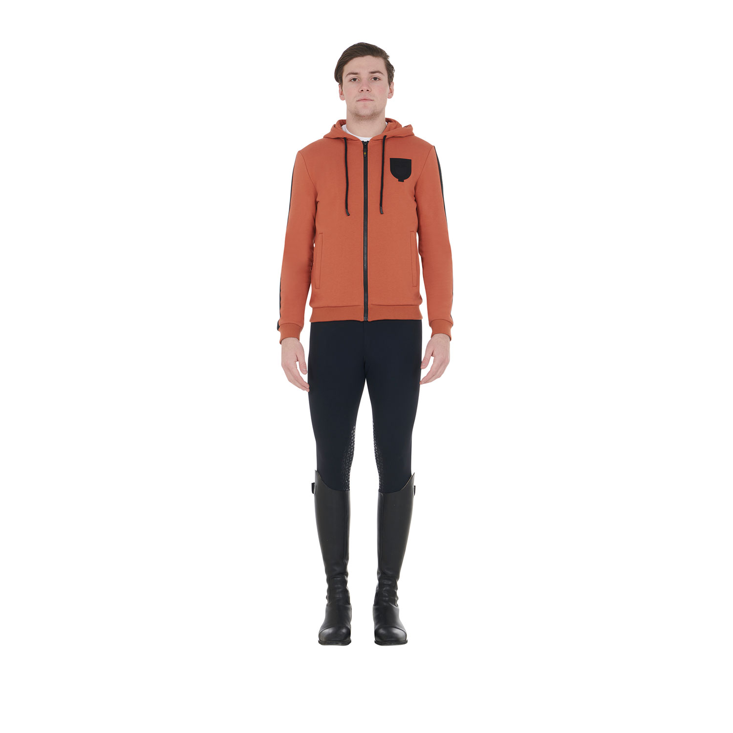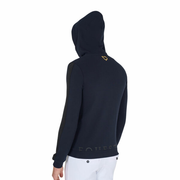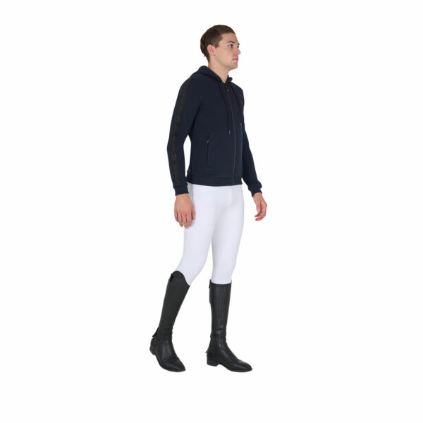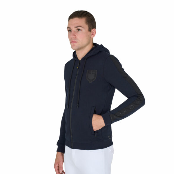 Felpa da uomo con cappuccio con cordini, full zip e tasche laterali. Realizzata in morbido cotone felpato di alta qualità, offre una sensazione di morbidezza al tatto e un calore avvolgente, perfetto per le giornate più fredde.