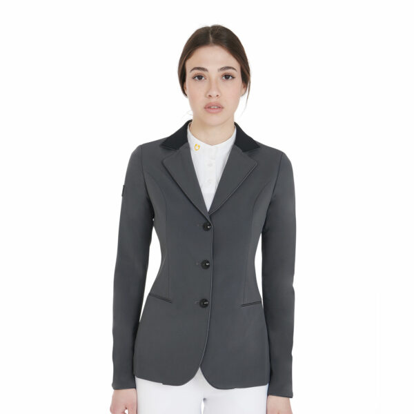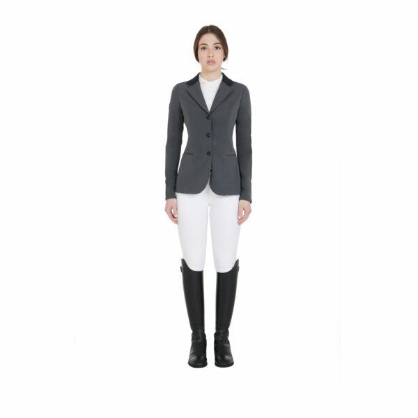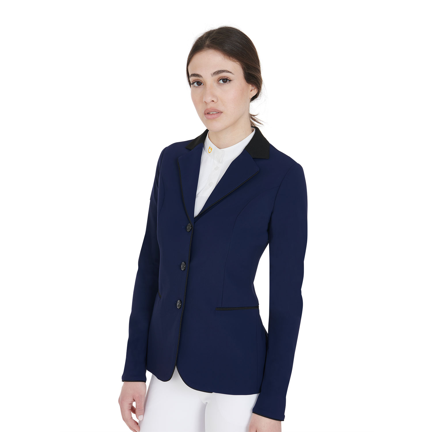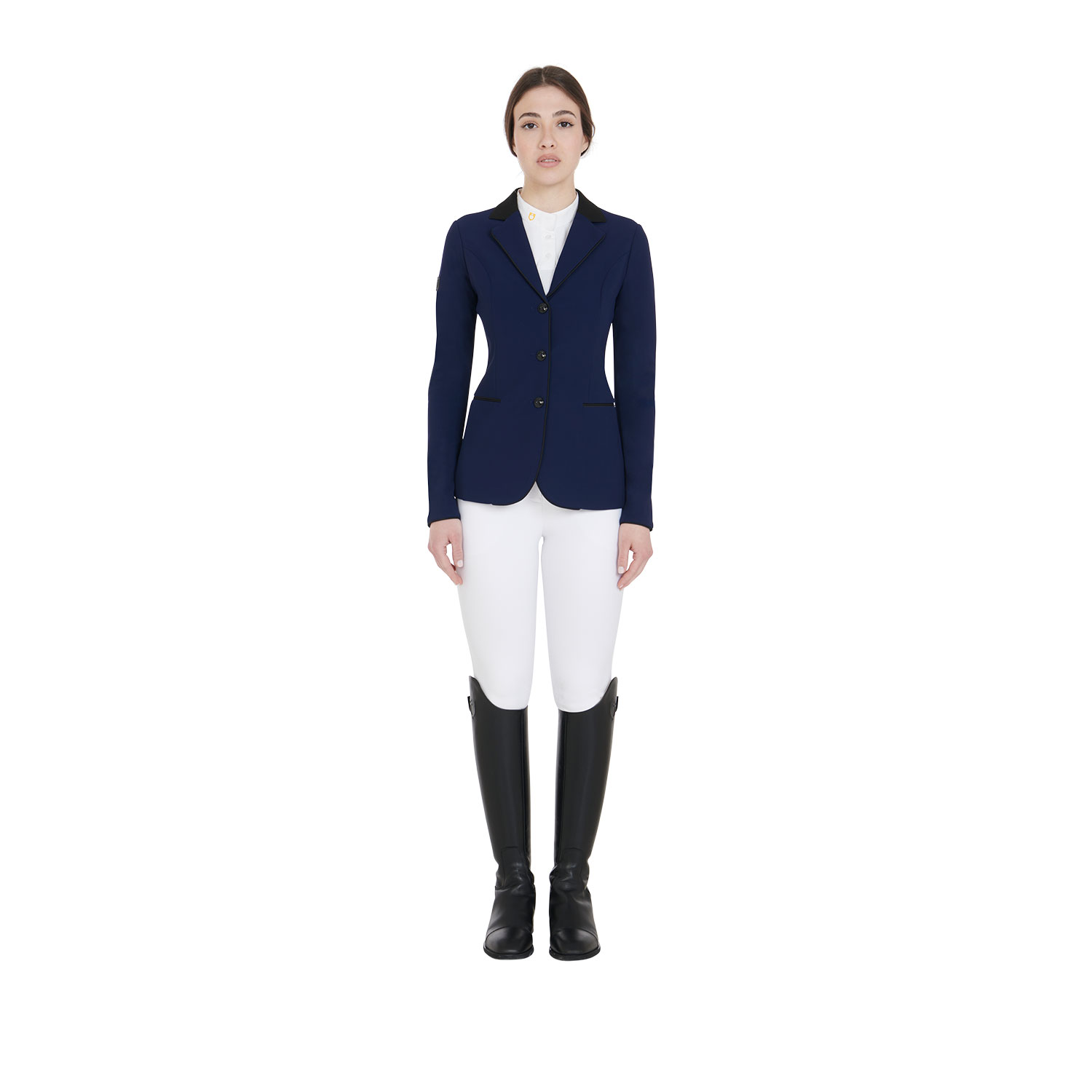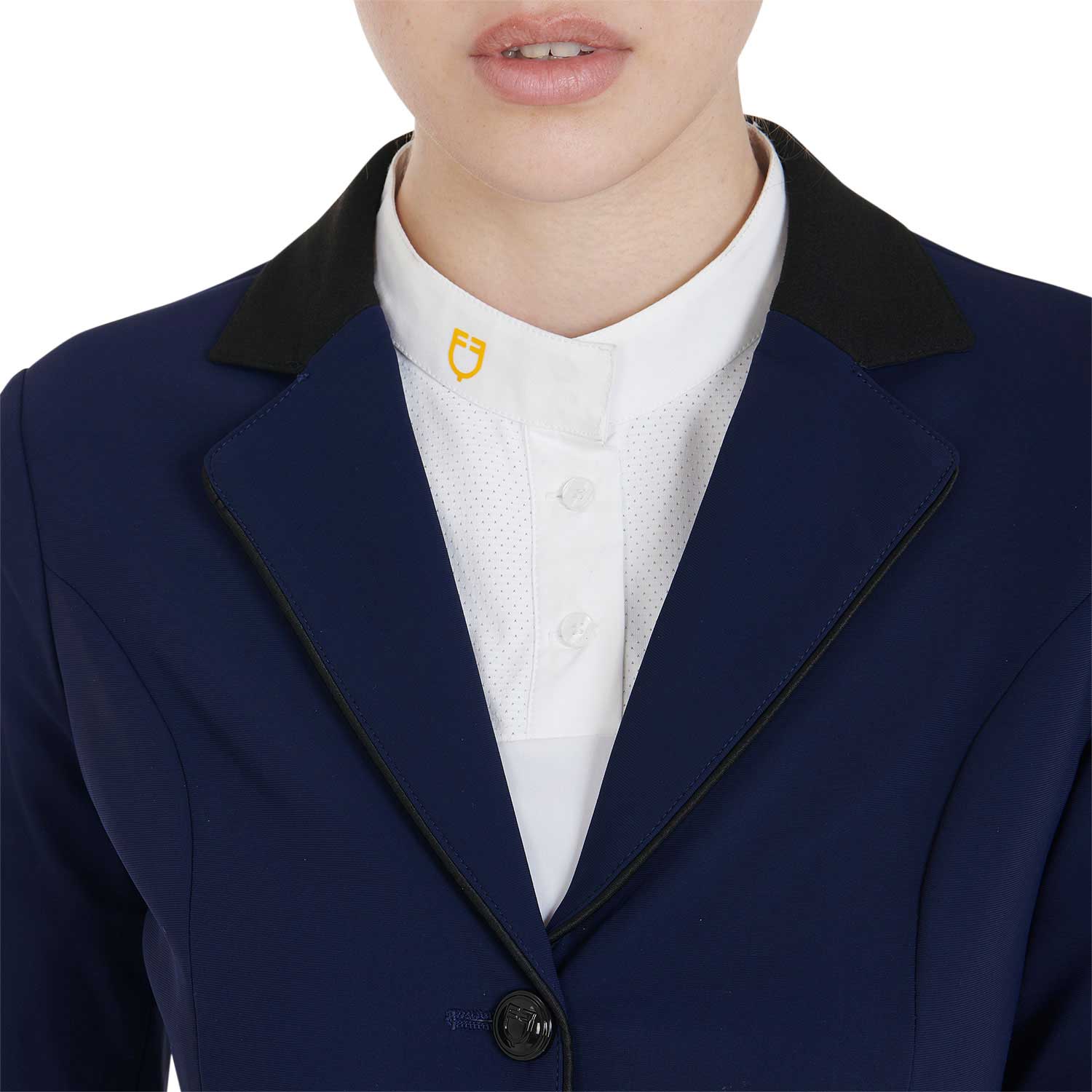 Giacca donna da concorso in tessuto tecnico traspirante e ultra leggero di ottima qualità. Tre bottoni, tasche a soffietto e patch con logo Equestro sulla spalla.