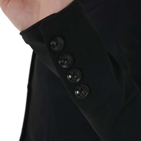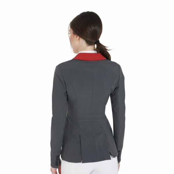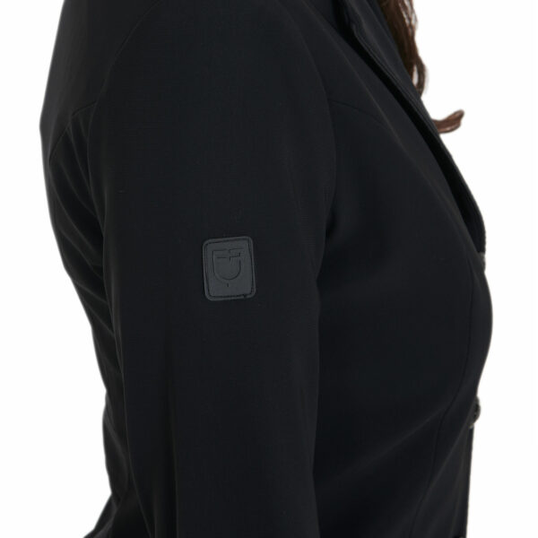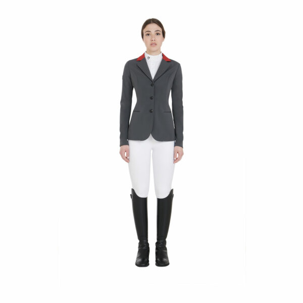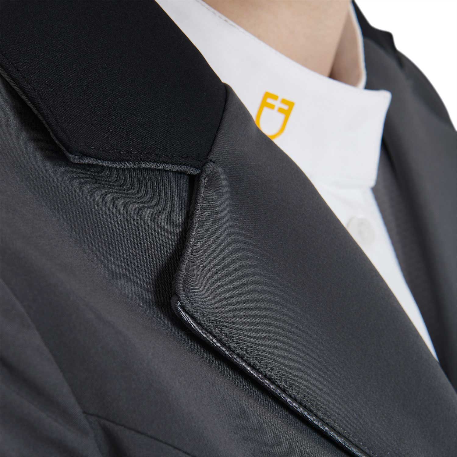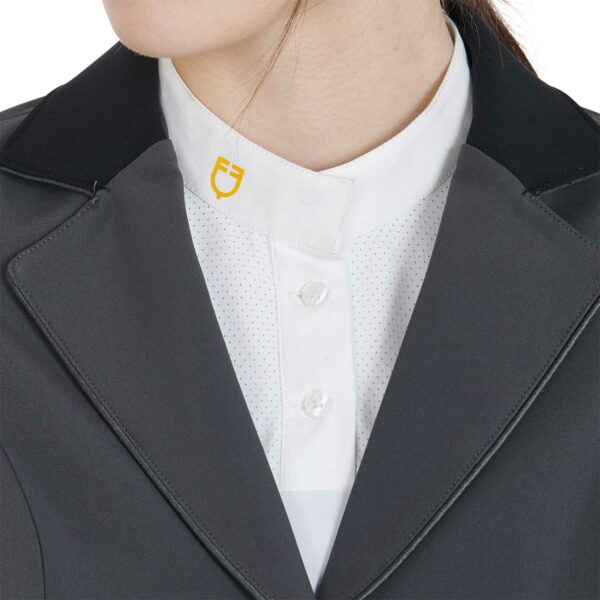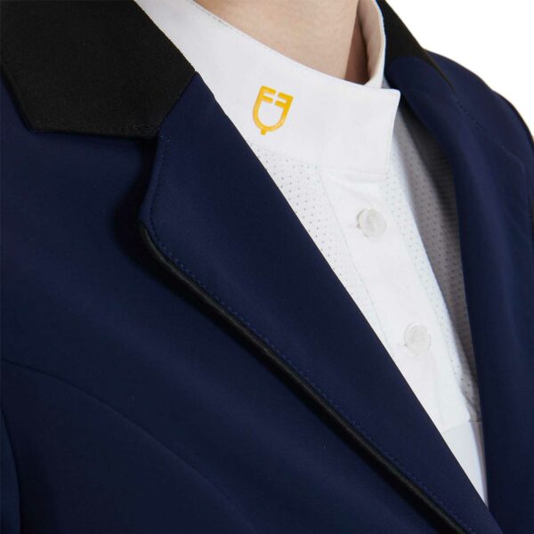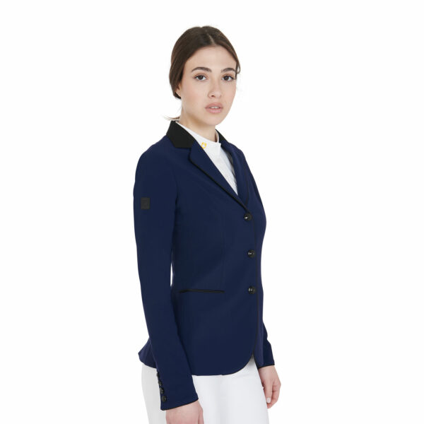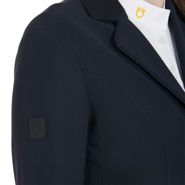 Giacca donna da concorso in tessuto tecnico traspirante e ultra leggero di ottima qualità. Tre bottoni, tasche a soffietto e patch con logo Equestro sulla spalla.