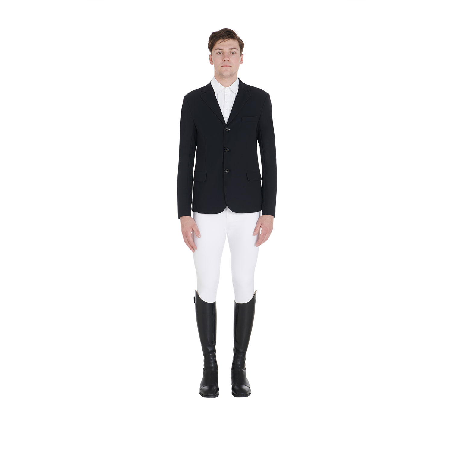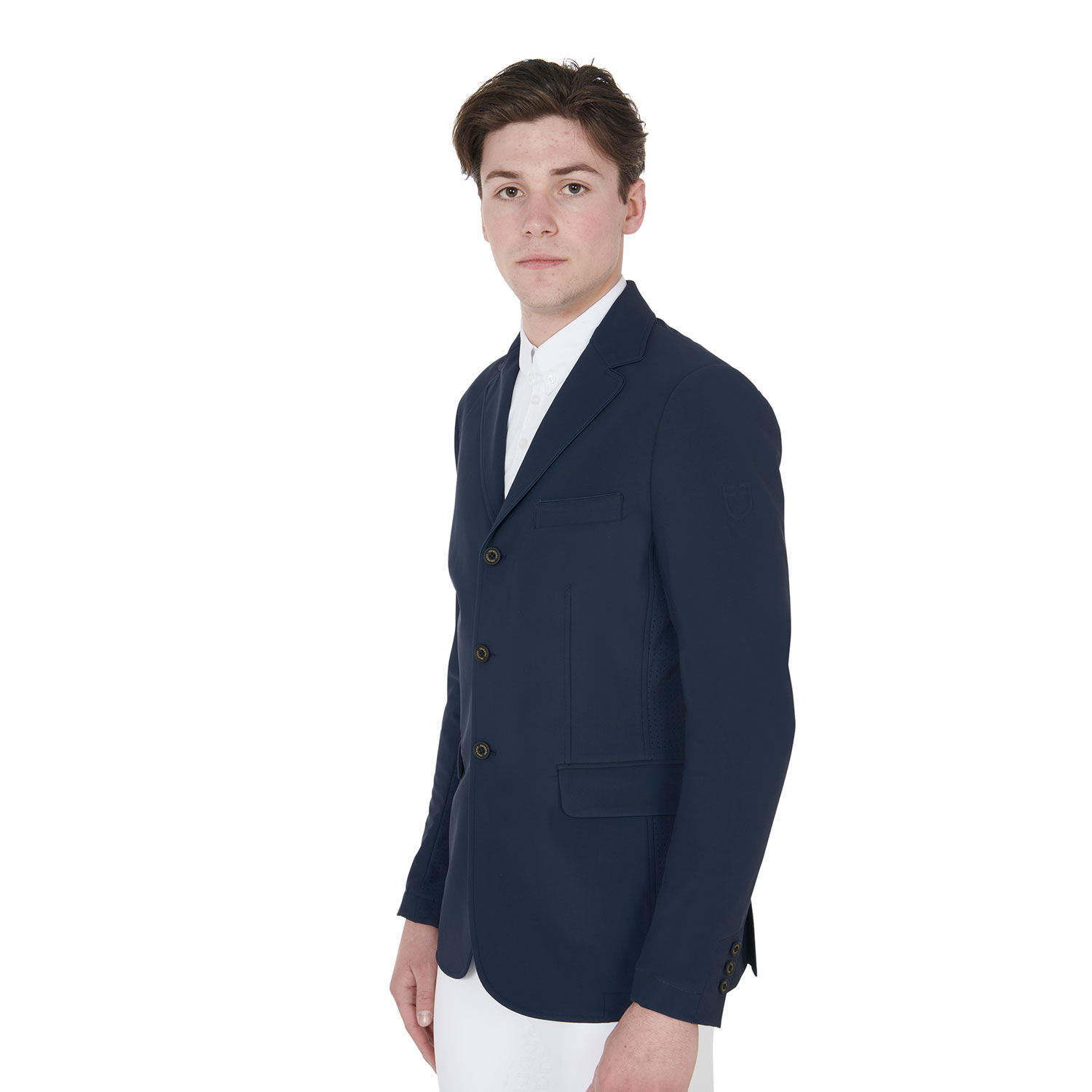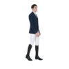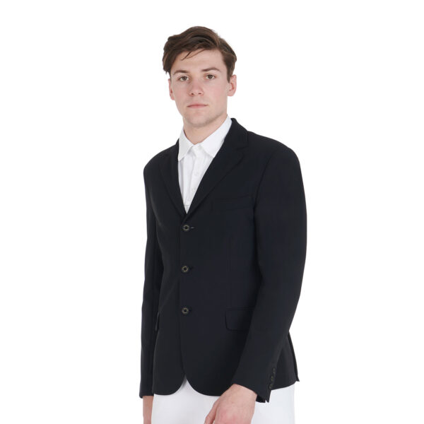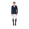 Giacca uomo, tre bottoni, da concorso, in tessuto tecnico traspirante e ultra leggero. Tasche a soffietto e logo Equestro sulla spalla.