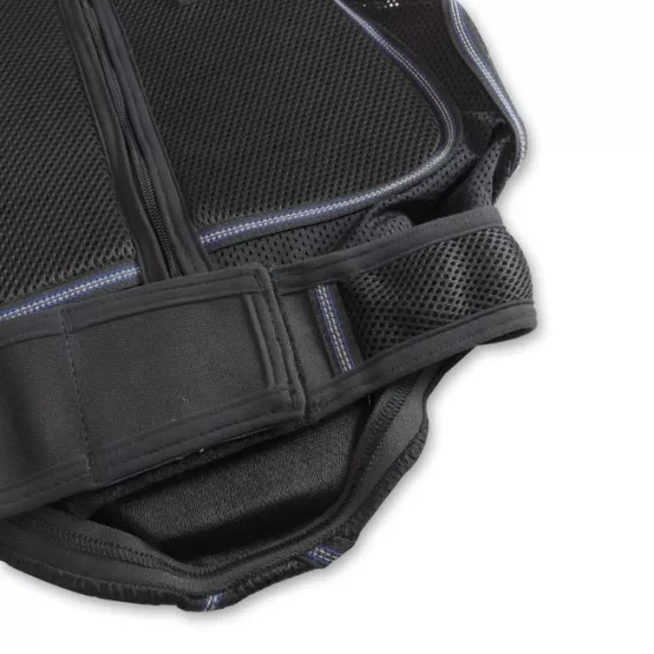 E’ dotato di fascia elastica removibile da allacciare in vita per mantenere la corretta posizione della protezione. Si chiude tramite zip frontale ed ha impunture giallo/blu lungo i bordi. Si può lavare anche in lavatrice a 30°C ed ha una rapida asciugatura.