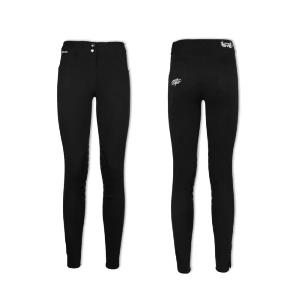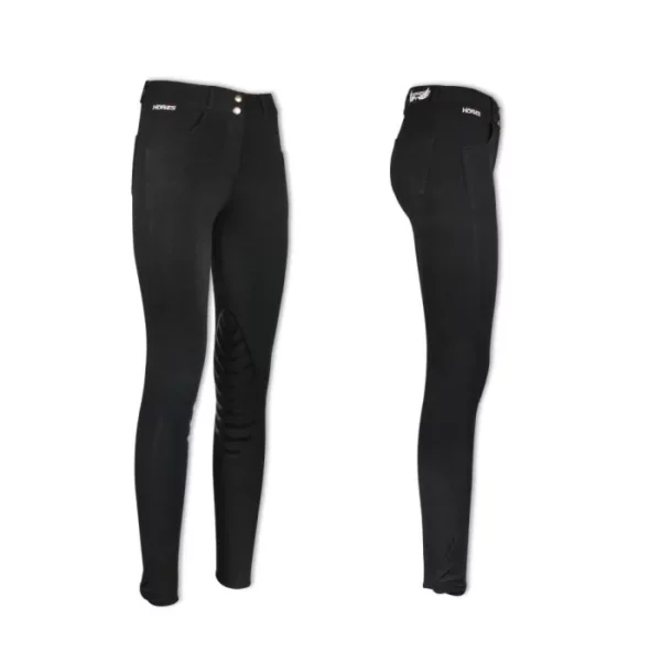 CARATTERISTICHE: In tessuto di cotone elasticizzato ( 95% cotone, 5% spandex ) questi pantaloni sono comodi e adatti sia per l’allenamento che per le gare. Grazie alla particolare patch con grip antiscivolo applicata nella zona dell’interno ginocchio, favoriscono un maggior equilibrio sulla sella. Disponibili in vari colori, hanno il logo Horses cucito in filo argentato sulla tasca posteriore sinistra, ed un altro logo è applicato su una toppa nella parte posteriore destra.