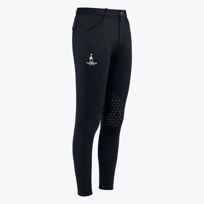 Realizzati in tessuto tecnico, hanno grip al ginocchio per ottimizzare l’aderenza alla sella. Con logo CT e Team Italia ricamato sulla gamba, sono perfetti sia in allenamento che in concorso. Disponibili nei colori blu navy oppure bianco.
