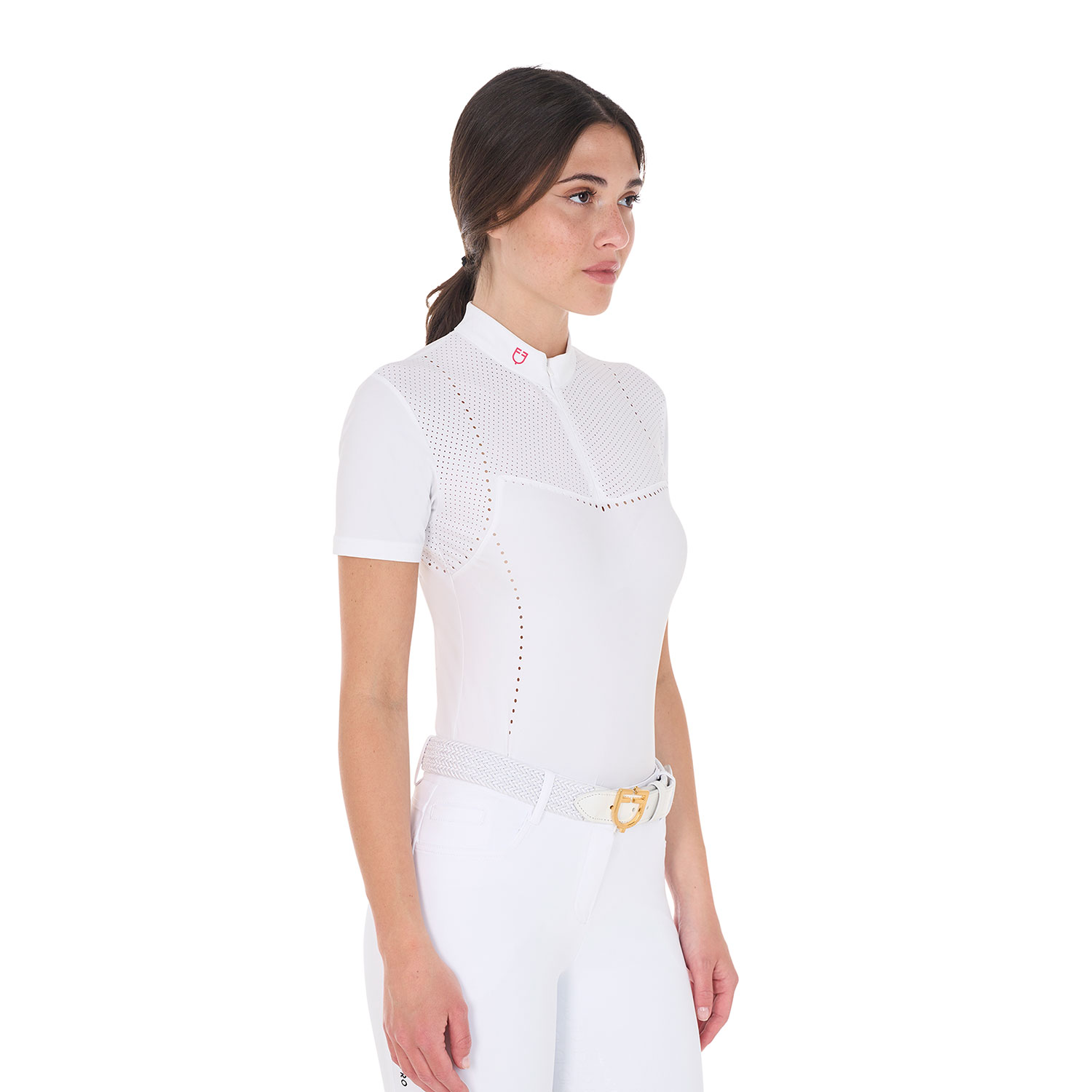 Polo donna slim fit a mezza manica realizzata in tessuto tecnico con inserti in tessuto traforato, in modo tale da facilitare l’evaporazione e la dispersione del sudore. Con le sue proprietà traspiranti mantiene la temperatura corporea ideale. Il taglio femminile segue la linea del corpo stringendosi sul punto vita, mettendo in risalto la silhouette. Un capo fresco, super performante con un’ottima vestibilità e una totale libertà dei movimenti. La polo presenta una chiusura frontale con zip a scomparsa ed è inoltre impreziosita da logo Equestro sul colletto in cotone alla coreana per un tocco all’ultima moda e al tempo stesso funzionale.