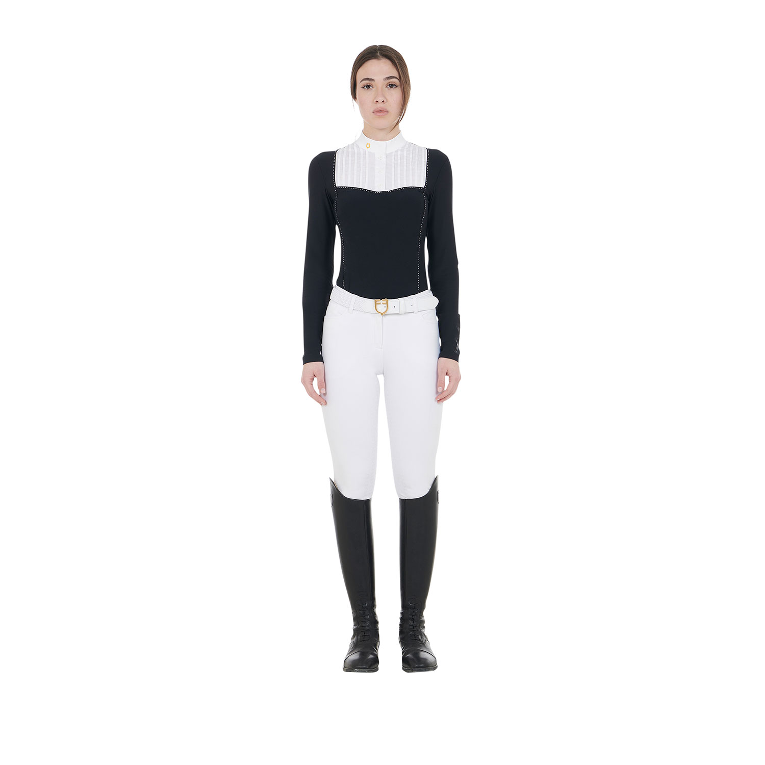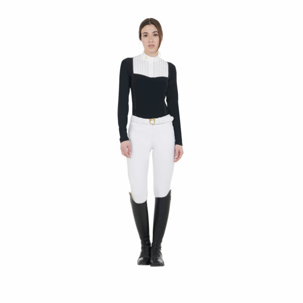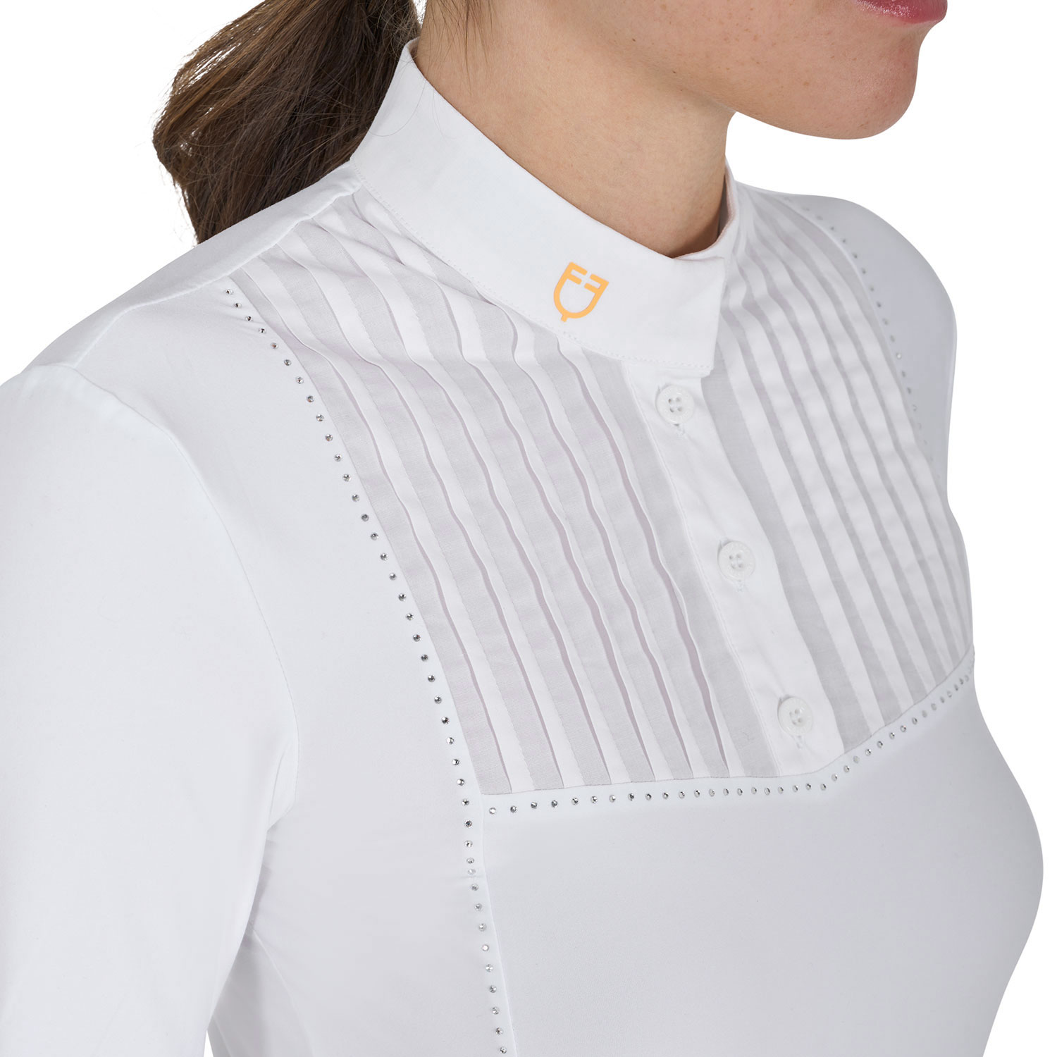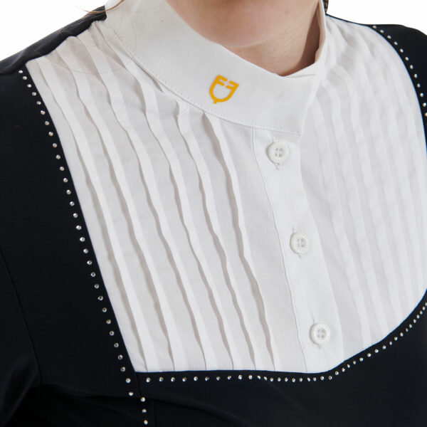 L’attenzione ai dettagli è ulteriormente valorizzata dal logo Equestro posizionato sul colletto e dagli inserti in strass sulla parte frontale, che aggiungono un tocco di brillantezza e raffinatezza al look.