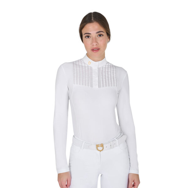 Polo da donna slim fit a maniche lunghe realizzata in tessuto tecnico con dettaglio plissettato in cotone cucito sul petto che aggiunge un tocco di eleganza distintiva al design. Una delle caratteristiche principali di questa polo è la sua eccezionale traspirabilità e capacità termoregolatrice. Questo significa che ti manterrà calda anche nelle giornate più fredde, mantenendo la temperatura corporea ideale per prestazioni ottimali.