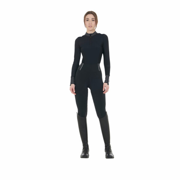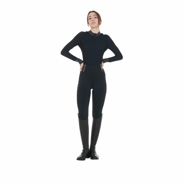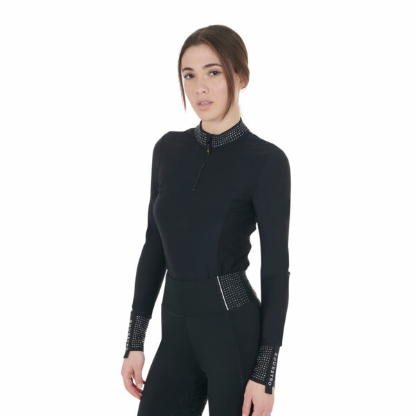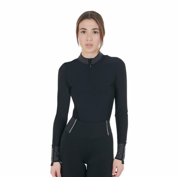 Polo donna da allenamento in tessuto tecnico, con le sue proprietà traspiranti e riscaldanti, che mantiene la temperatura corporea ideale anche quando l’allenamento è intenso.
