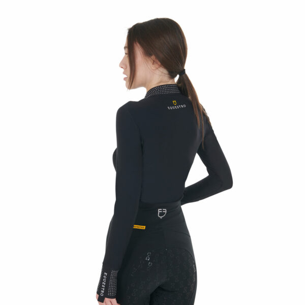I dettagli rifiniti con inserti a contrasto e la grafica scritta “Equestro” sui polsini conferiscono a questa polo un tocco di eleganza minimalista. È la scelta perfetta per chi cerca un capo che unisca perfettamente moda e performance durante l’allenamento.
