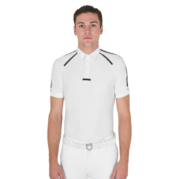 Polo da uomo slim fit a mezza manica realizzata in tessuto tecnico. L’innovativo tessuto presenta una struttura con inserti traforati che favorisce un’elevata traspirabilità e ottimali performance durante le competizioni.