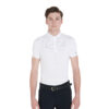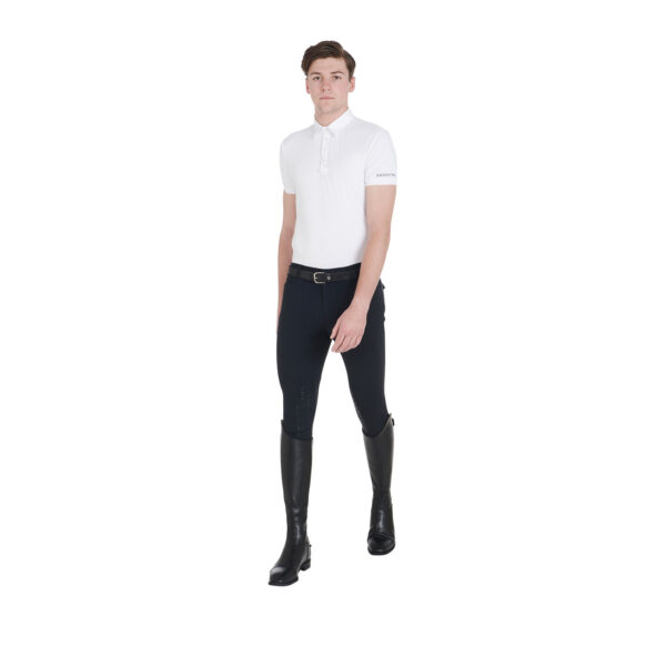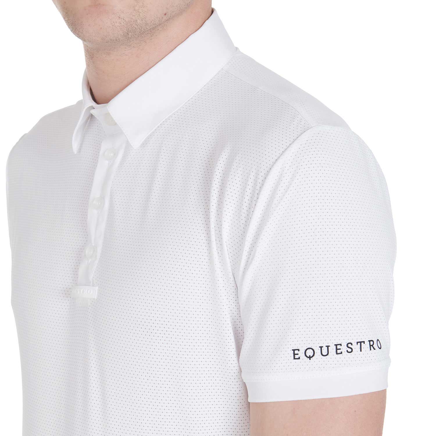 Le maniche corte sono rifinite con elastico, la chiusura è a quattro bottoni ed è impreziosita dalla scritta Equestro sulla manica sinistra.