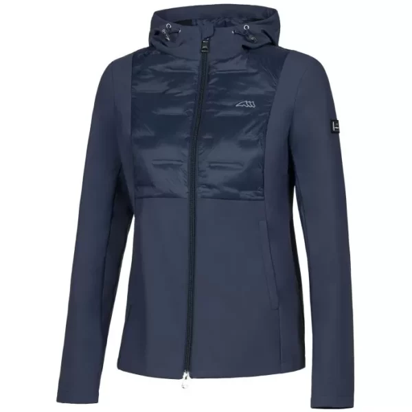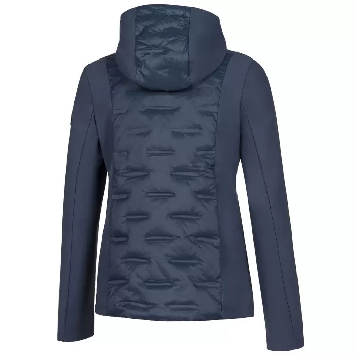 Giacca da donna in soft shell/nylon realizzata in tessuto elasticizzato confortevole e traspirante per garantire la massima libertà di movimento. Caratterizzata da pannelli termosaldati a caldo, cappuccio regolabile, zip a doppio cursore e 2 tasche con zip. Logo Equiline stampato sul petto e metal logo sulla manica.