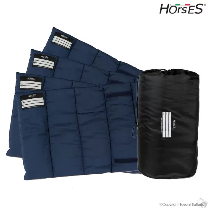Sottofasce da riposo per cavalli Horses realizzate in tessuto imbottito. Sono vendute in set da 4 pezzi e sono fornite di pratica sacca portafasce in nylon. Misura 75 x 45 cm