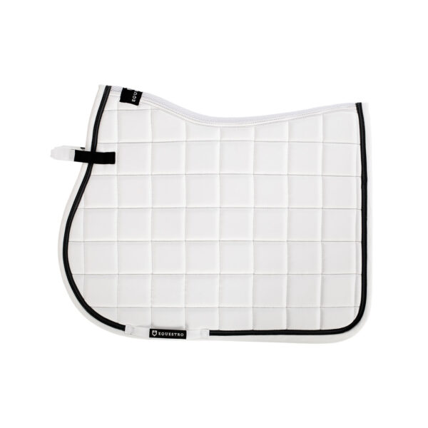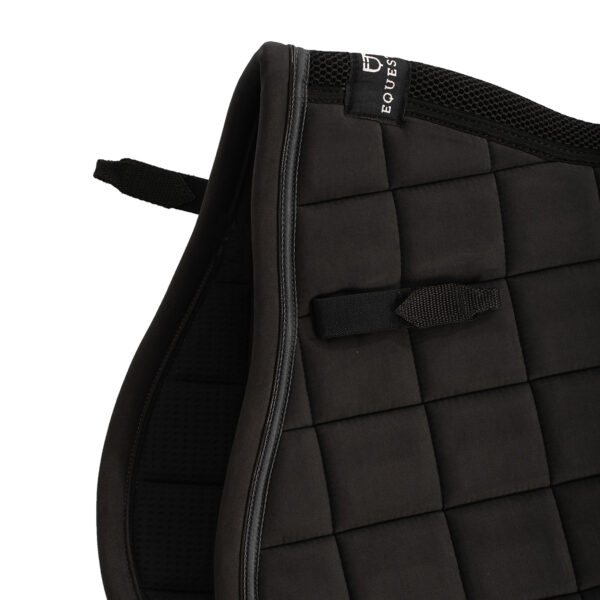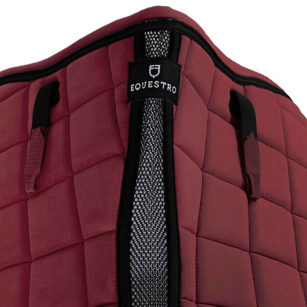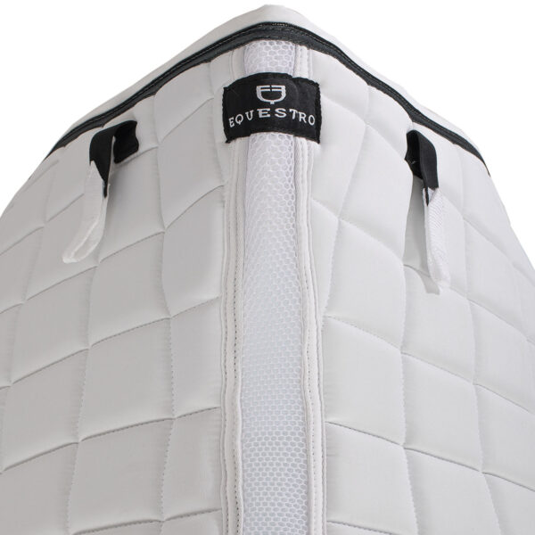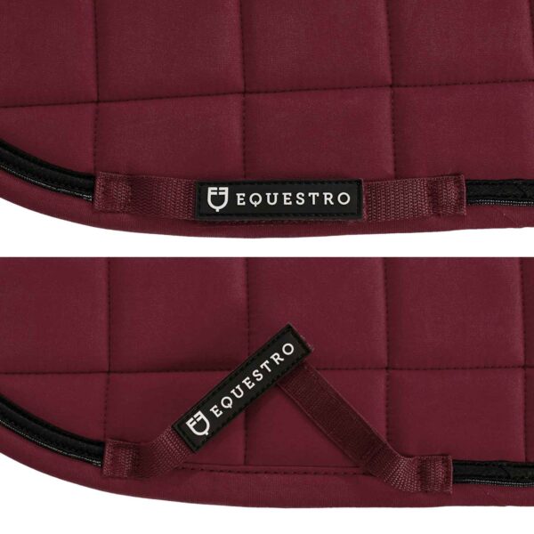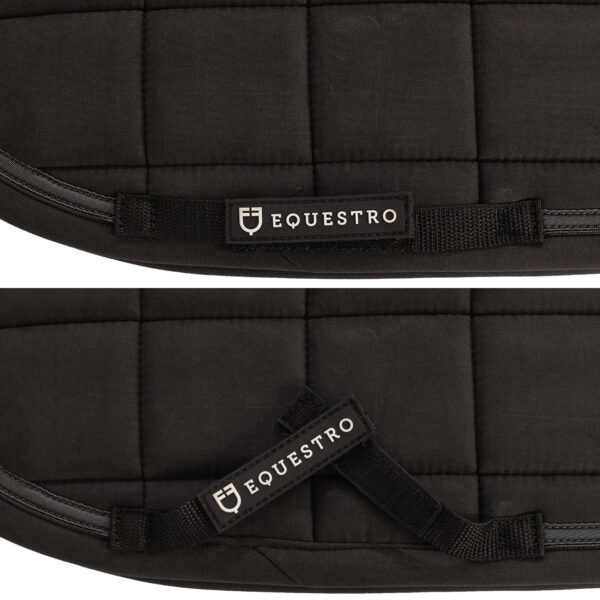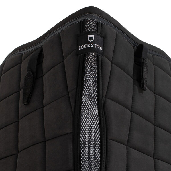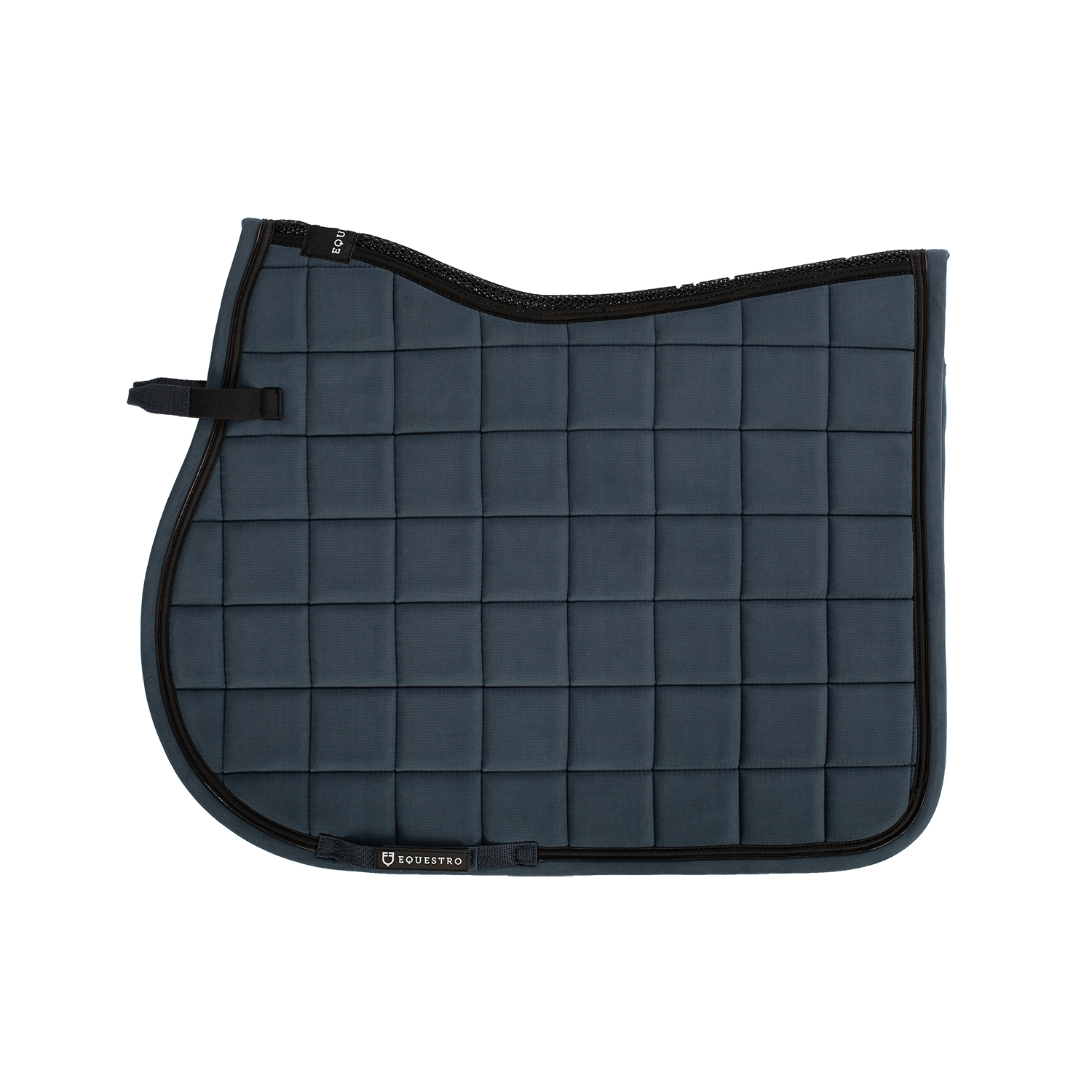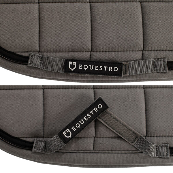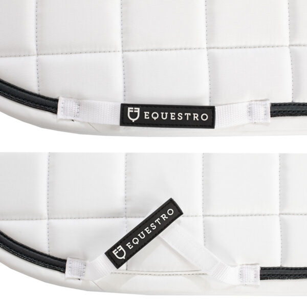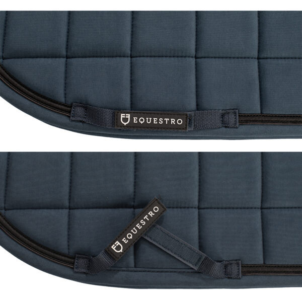 Il sottosella, ideato per tutte le stagioni, è decorato con motivo square, piping più trim nero e parch con logo e scritta Equestro dul garrese.