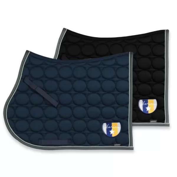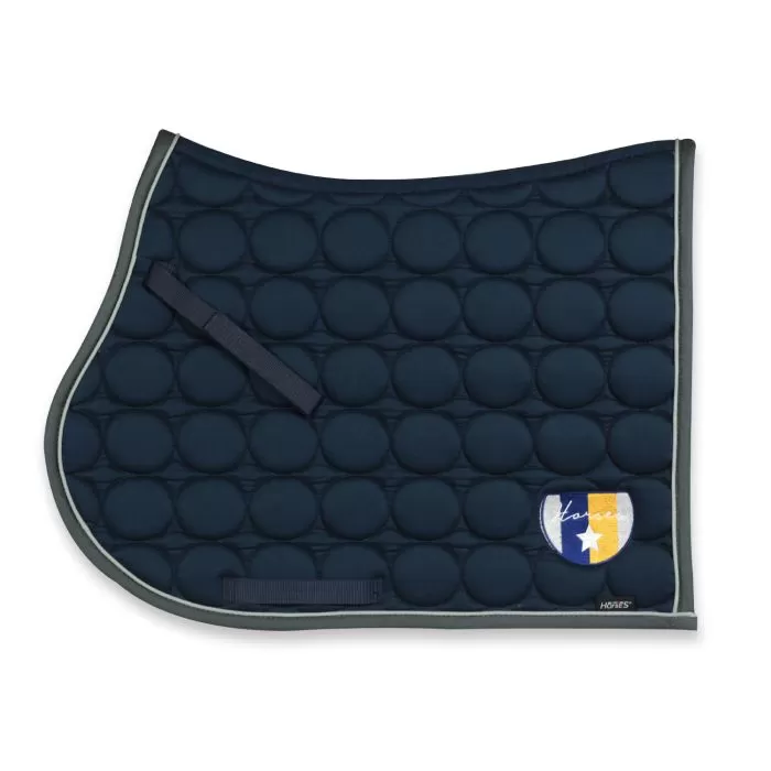 Sottosella inglese realizzato in cotone con trapuntatura a cerchi. La sua imbottitura lo rende super confortevole per il cavallo e attutisce meglio il peso della sella, mentre la parte sottostante è in coolmax traspirante. Ha una particolare forma squadrata ed è bordato di grigio scuro con bordino più piccolo di colore bianco. E’ disponibile nei colori nero oppure blu navy, ed ha lo stemma Horses ricamato sulla parte sinistra.