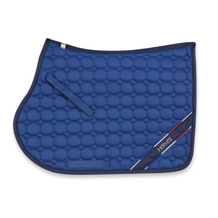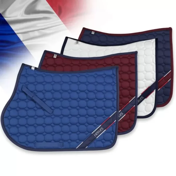 Sottosella inglese realizzato in cotone imbottito con trapuntatura ottagonale, con parte sottostante in coolmax traspirante. Ha bordino a contrasto, e inserto in tessuto con logo Horses ricamato sulla parte sinistra, che richiama i colori della bandiera francese. E’ disponibile nei colori Bianco con bordo Blu Navy, Royal Blu con bordo Blu Navy, Blu Navy con Bordo Bordeaux e Bordeaux con bordo Blu Navy.