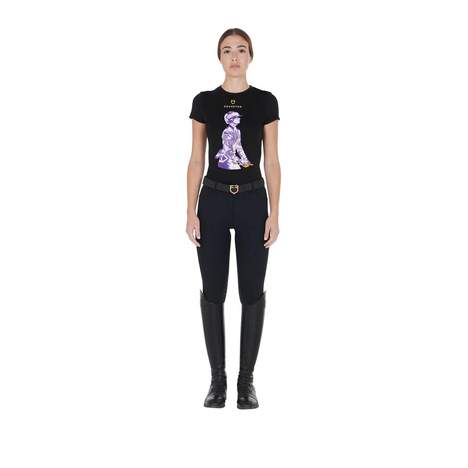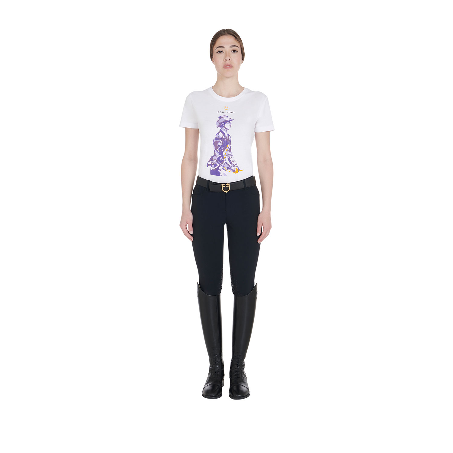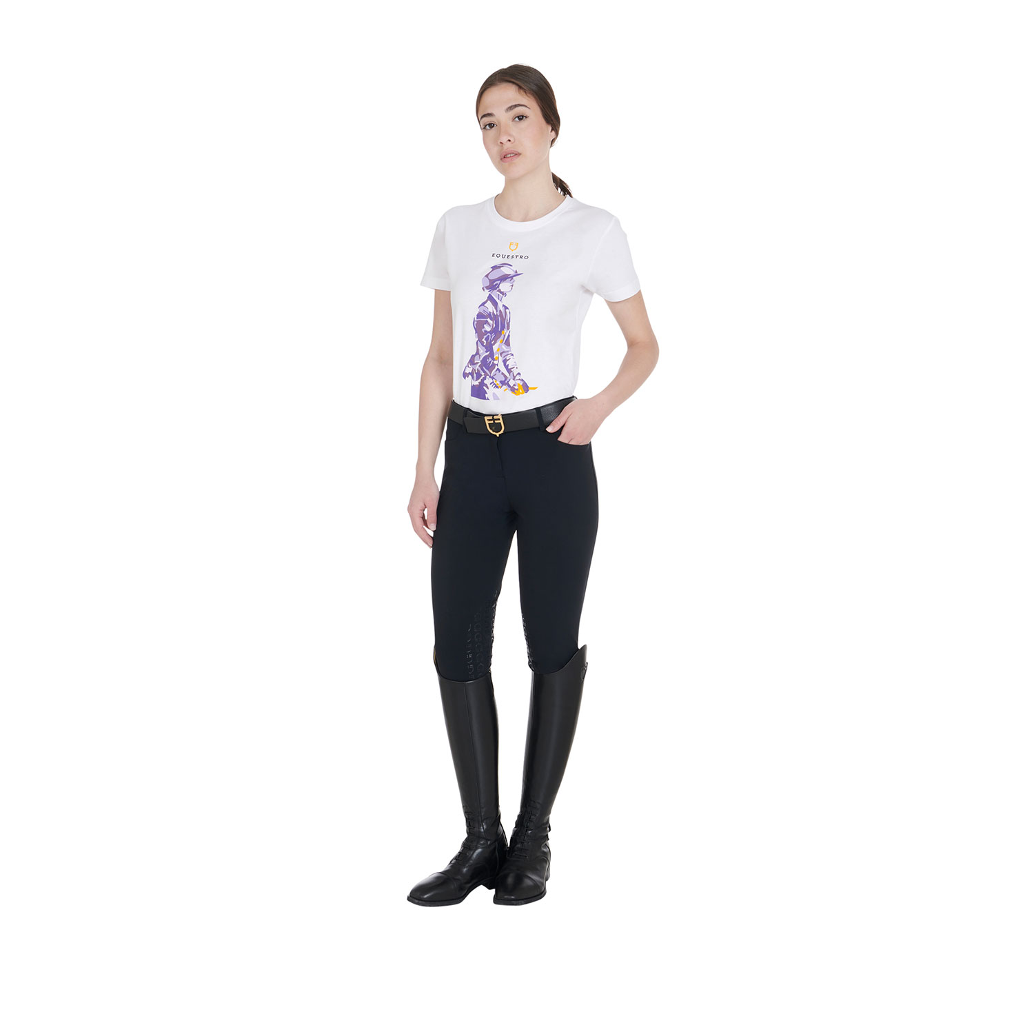 Presenta un’eleganza minimale, impreziosita dalla stampa colorata e logo Equestro con scritta stampato sul petto.