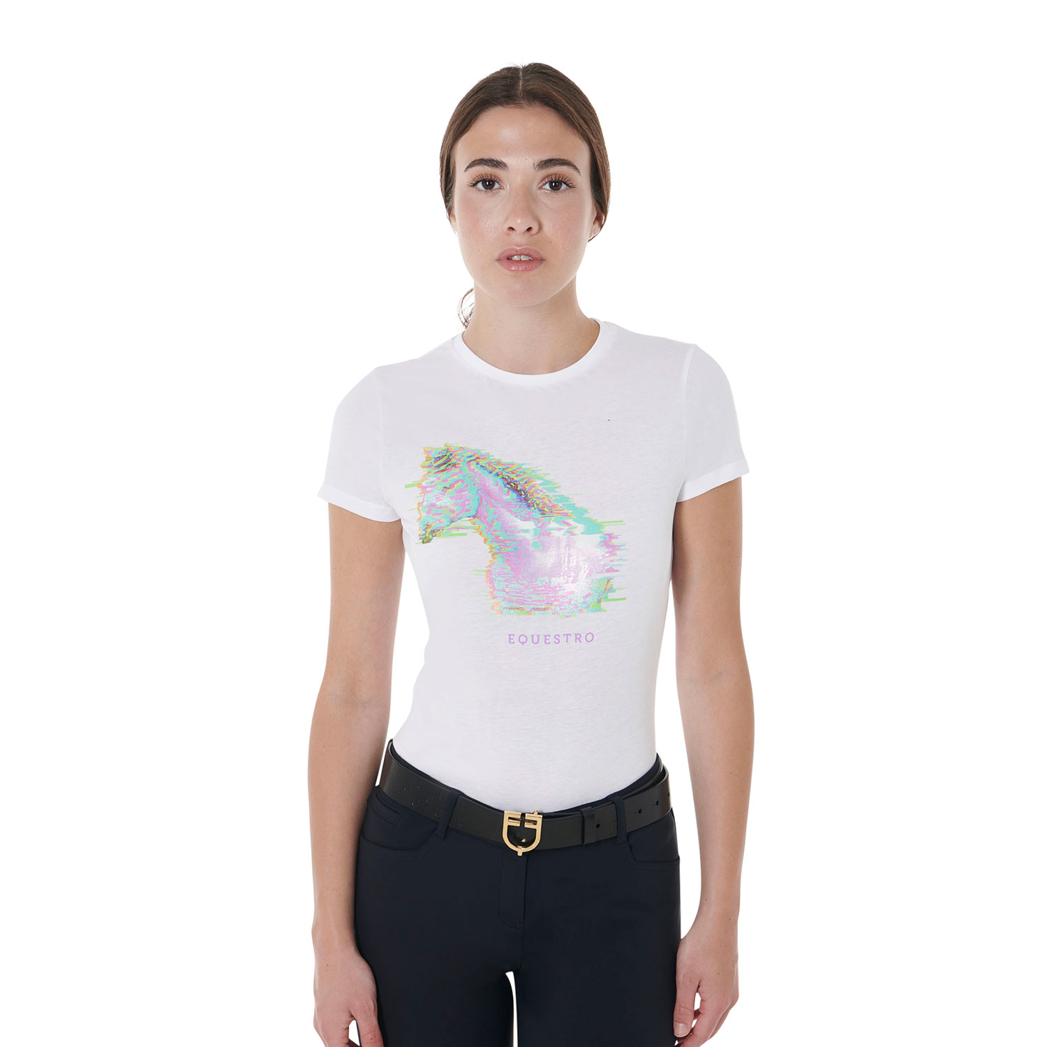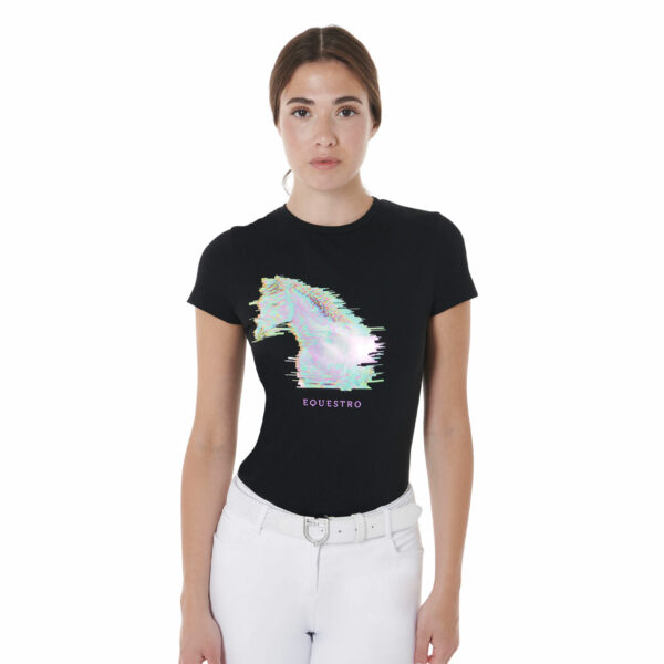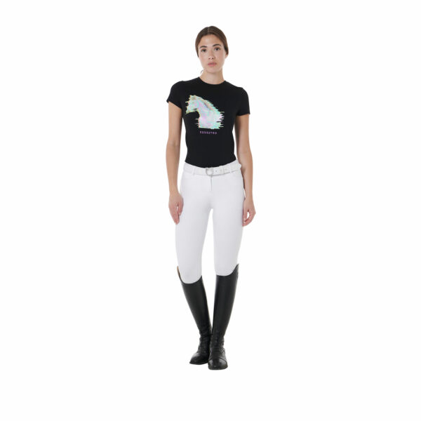 La particolarità di questo capo è data dalla stampa multicolore raffigurante la sagoma di cavaliere e cavallo nel momento del salto, ulteriormente impreziosita da logo e scritta Equestro.