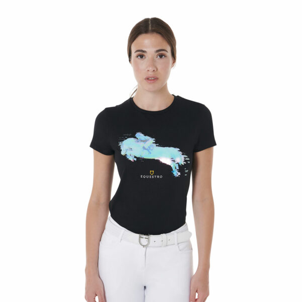 La particolarità di questo capo è data dalla stampa multicolore raffigurante la sagoma di cavaliere e cavallo nel momento del salto, ulteriormente impreziosita da logo e scritta Equestro.