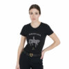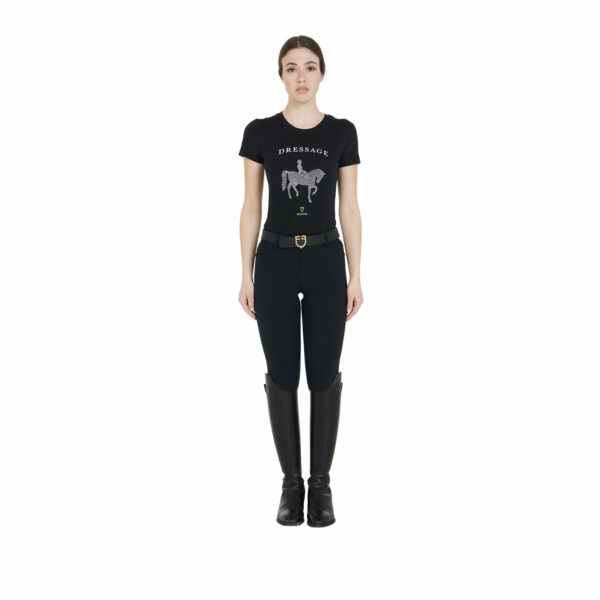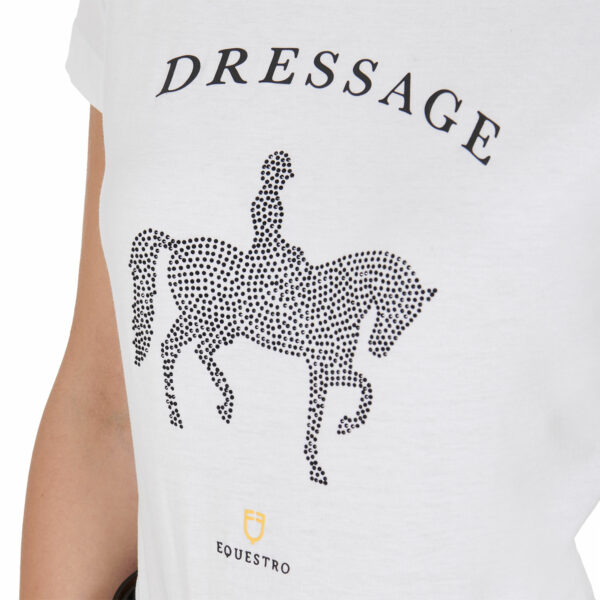 T-shirt donna slim fit, in cotone a mezza manica, impreziosita da una composizione di strass, scritta “dressage” e logo Equestro.
