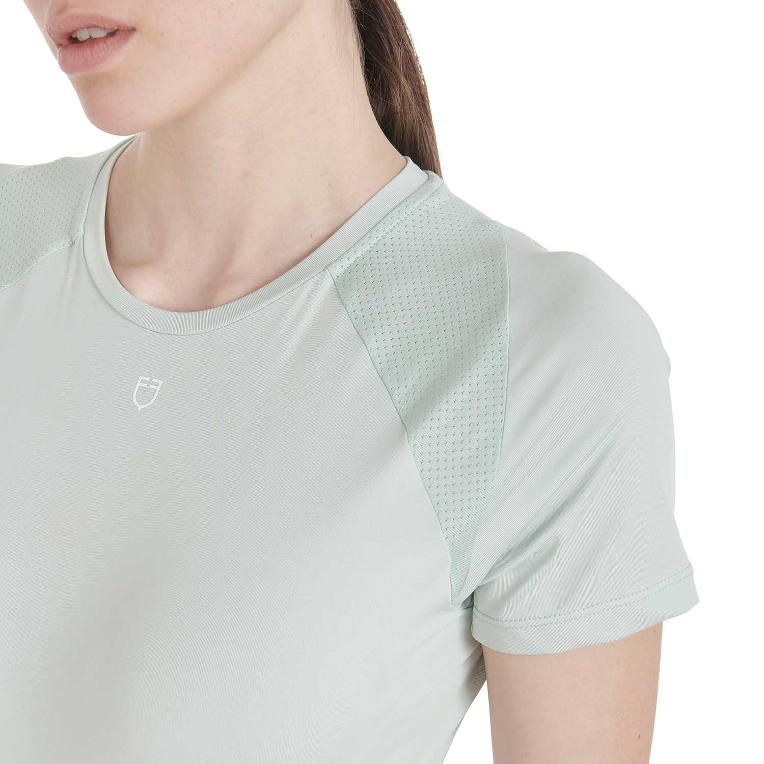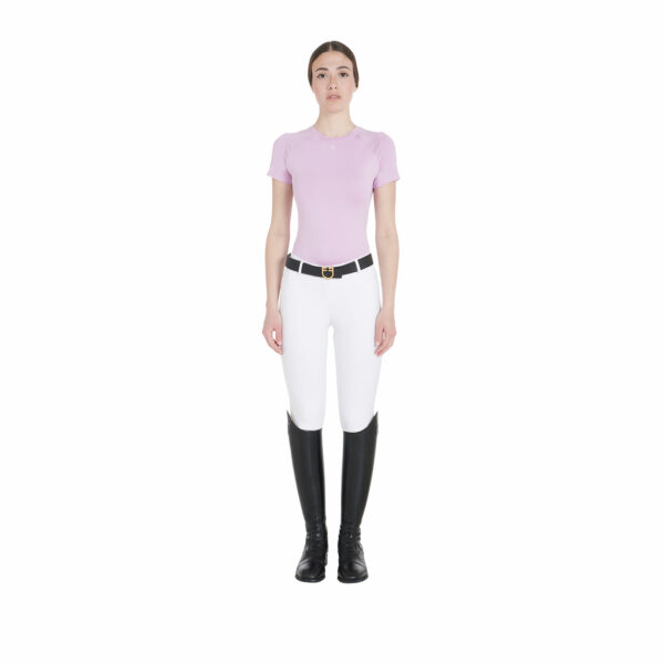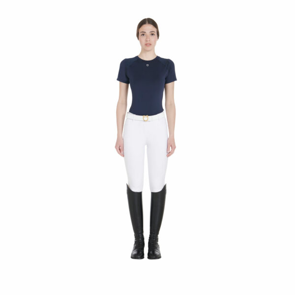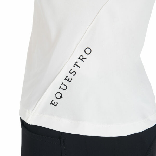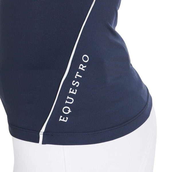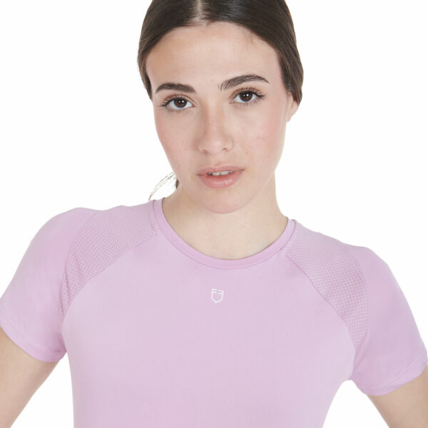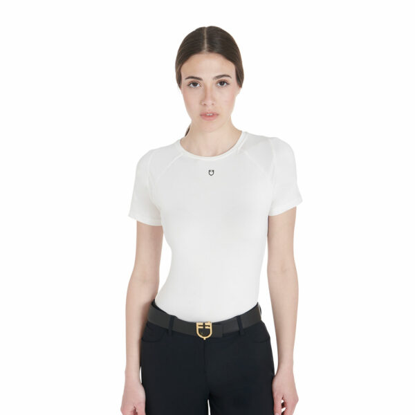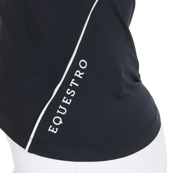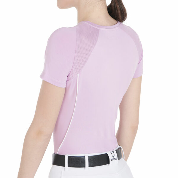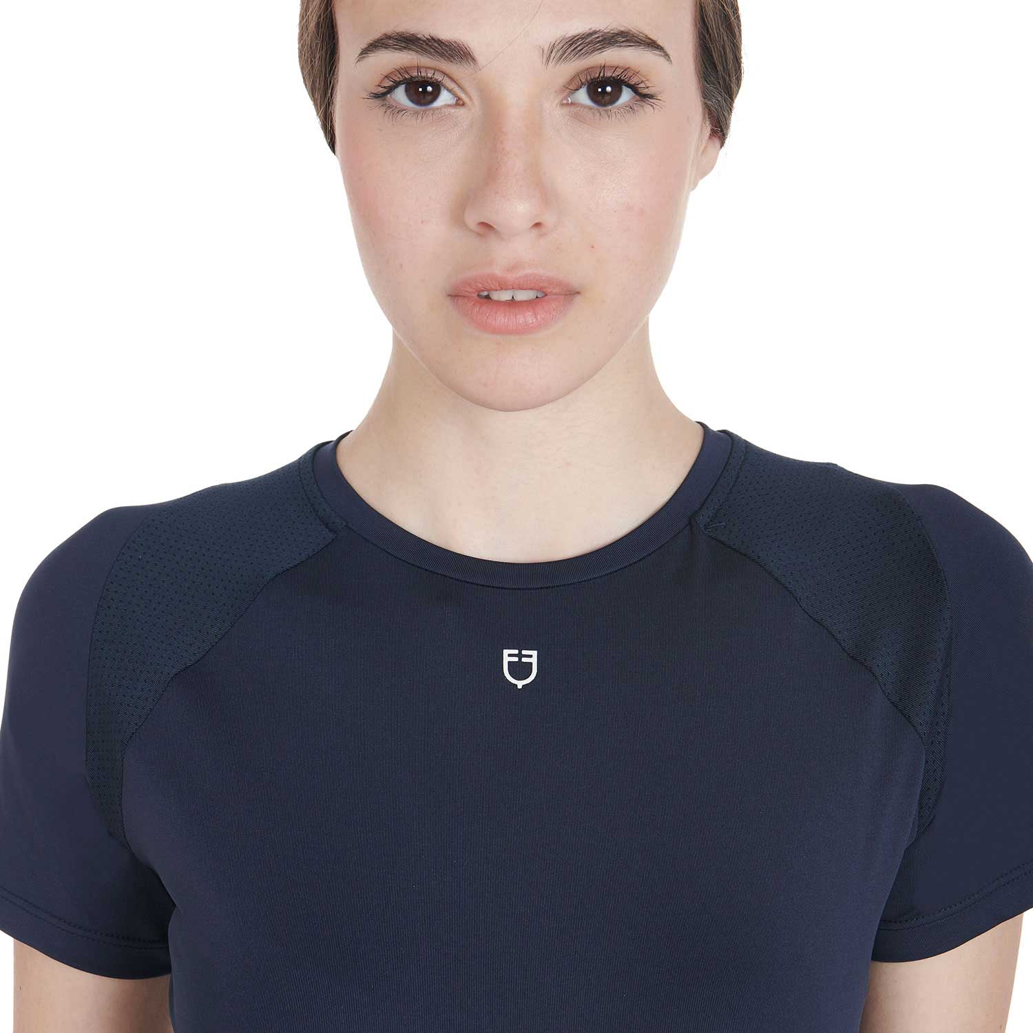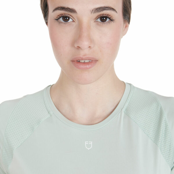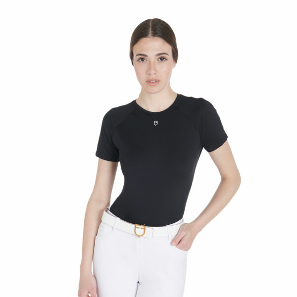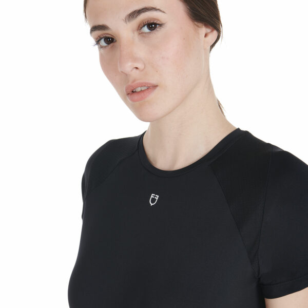 T-shirt donna slim fit, in tessuto tecnico traspirante a mezza manica, è impreziosita con piping, logo del brand e scritta Equestro laterale.