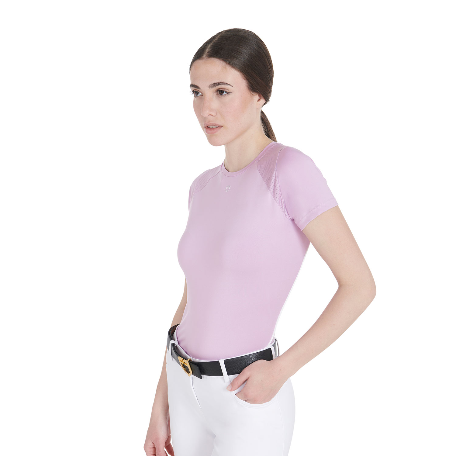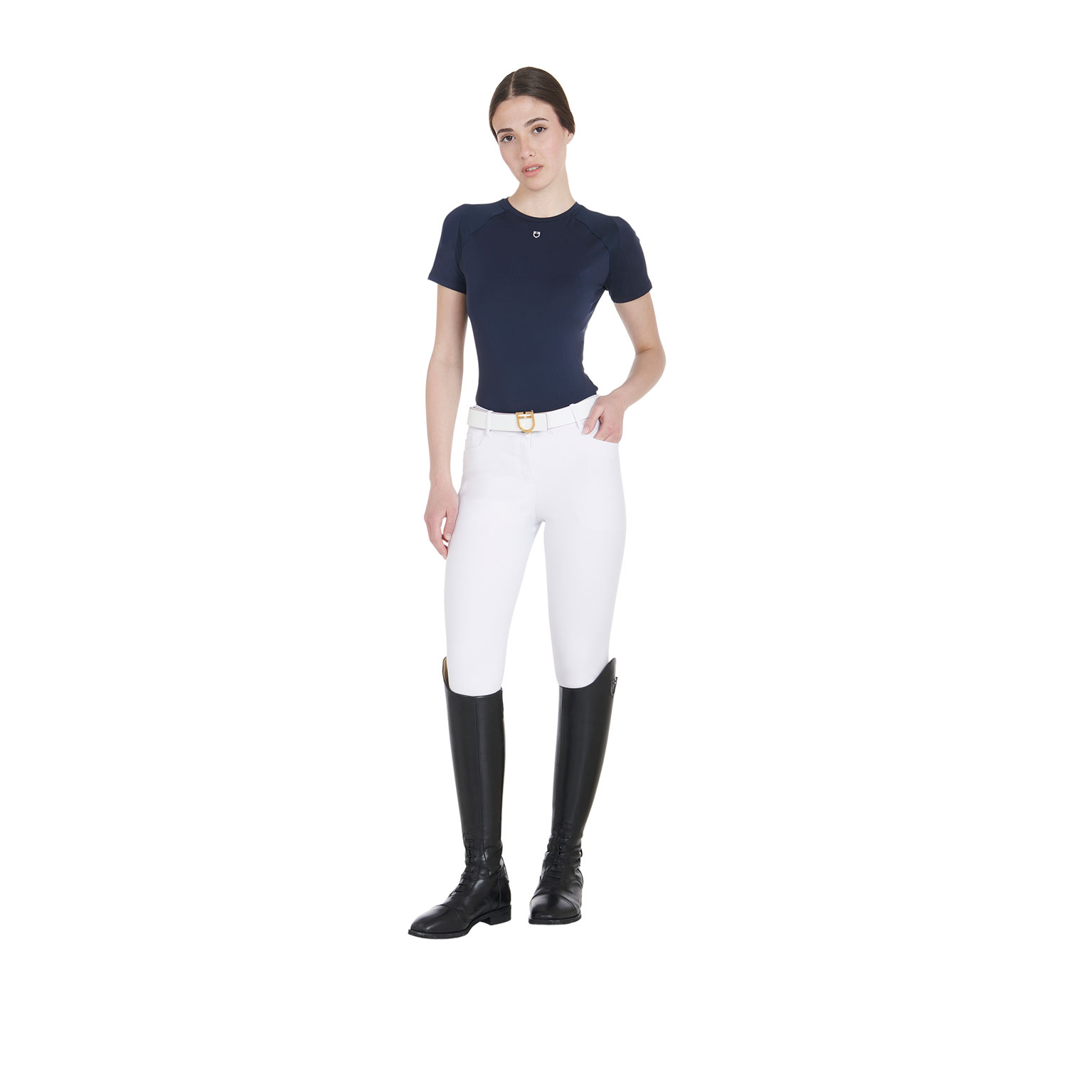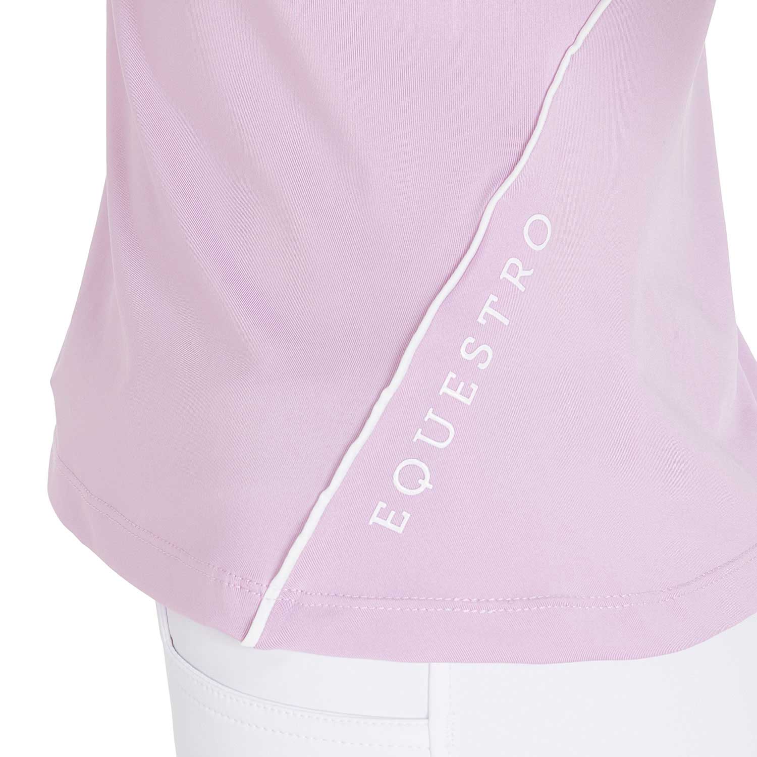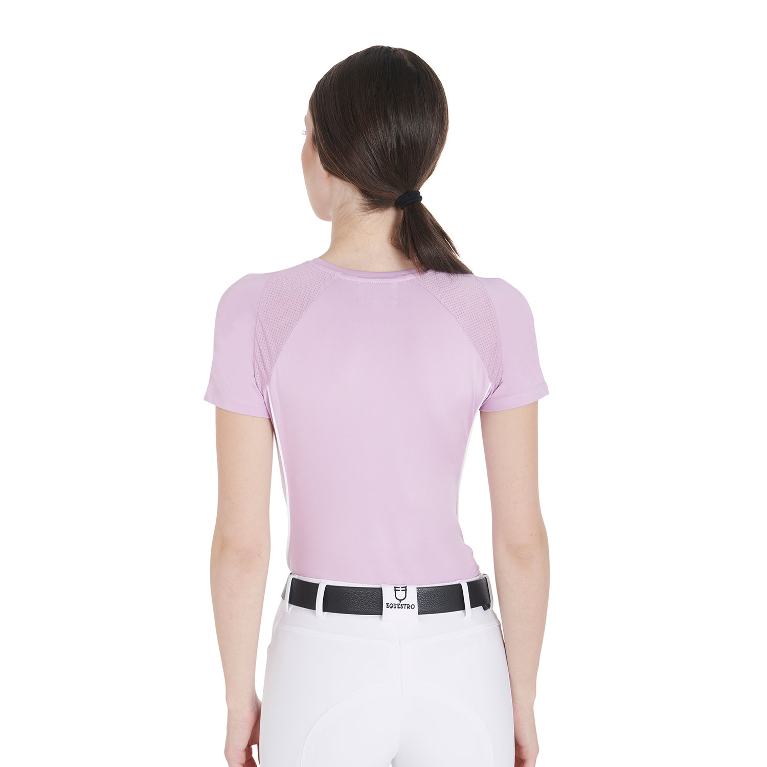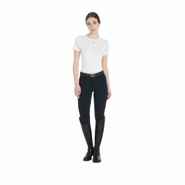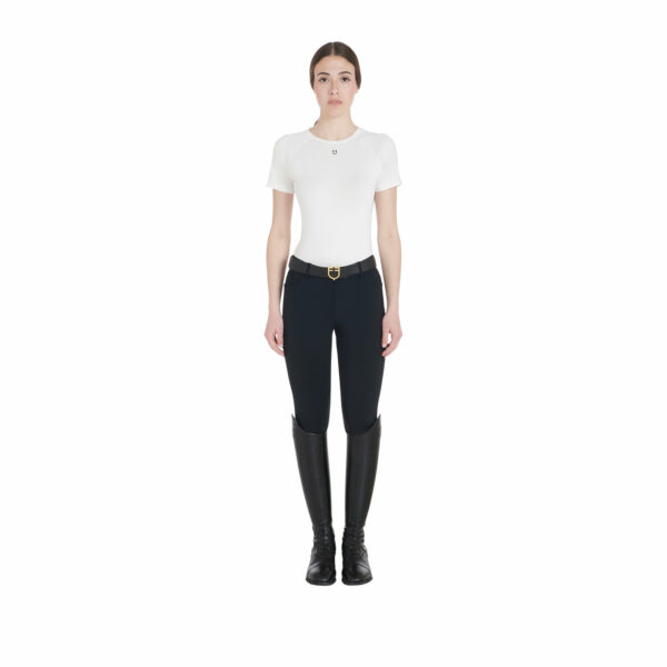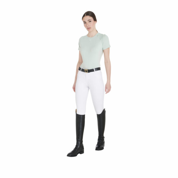 T-shirt donna slim fit, in tessuto tecnico traspirante a mezza manica, è impreziosita con piping, logo del brand e scritta Equestro laterale.