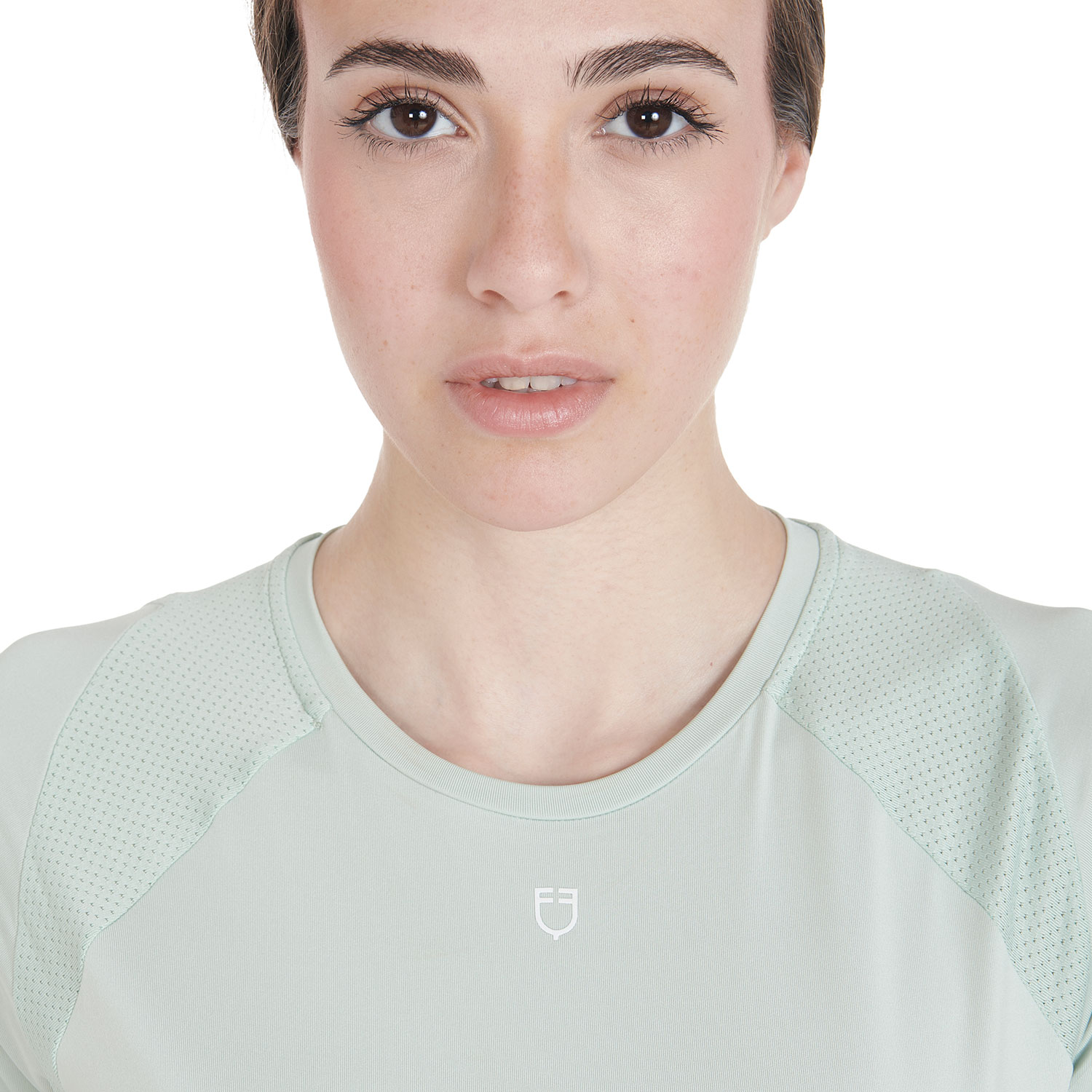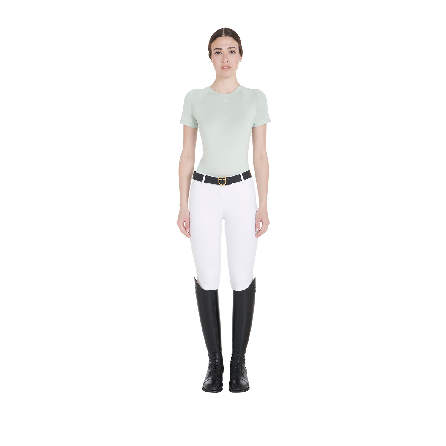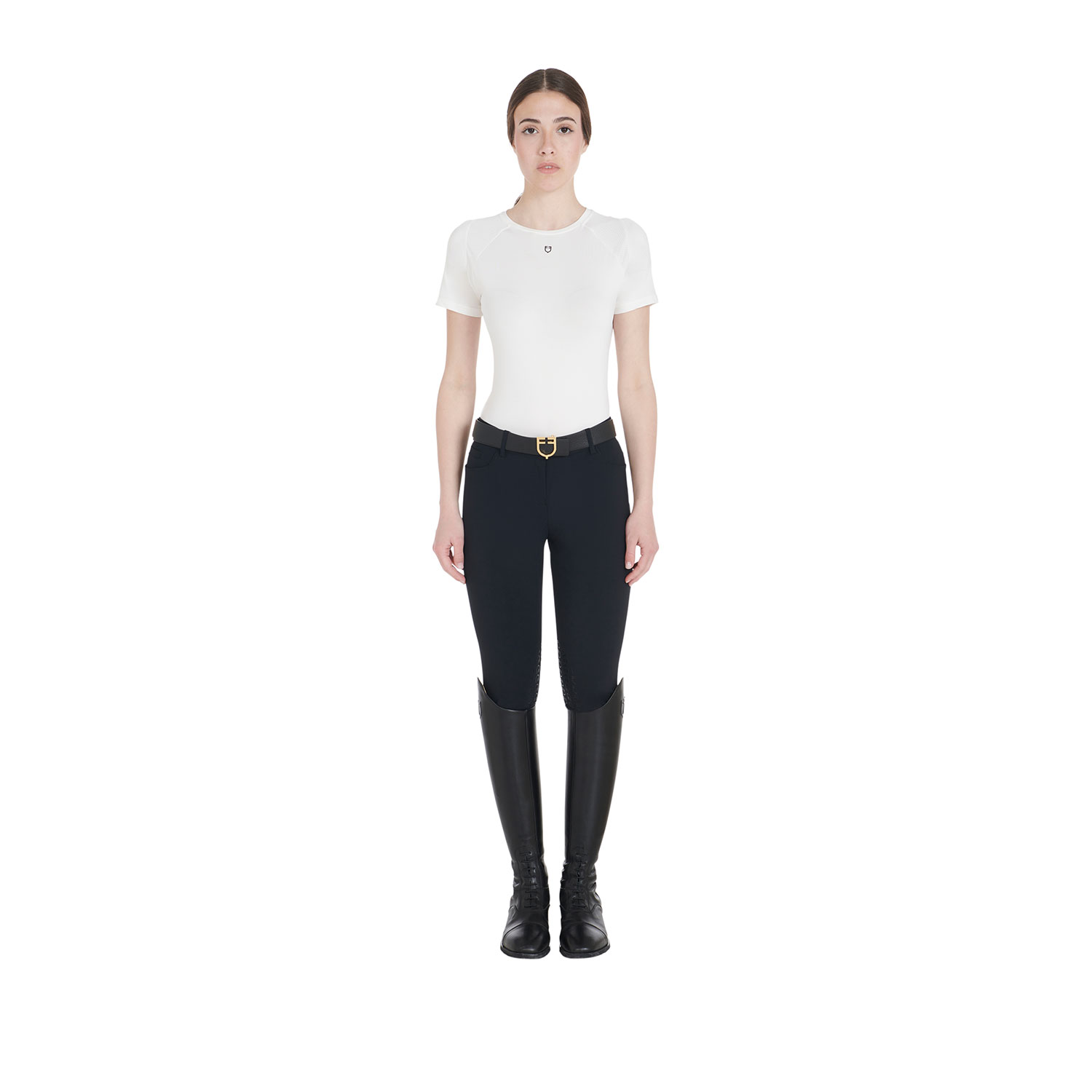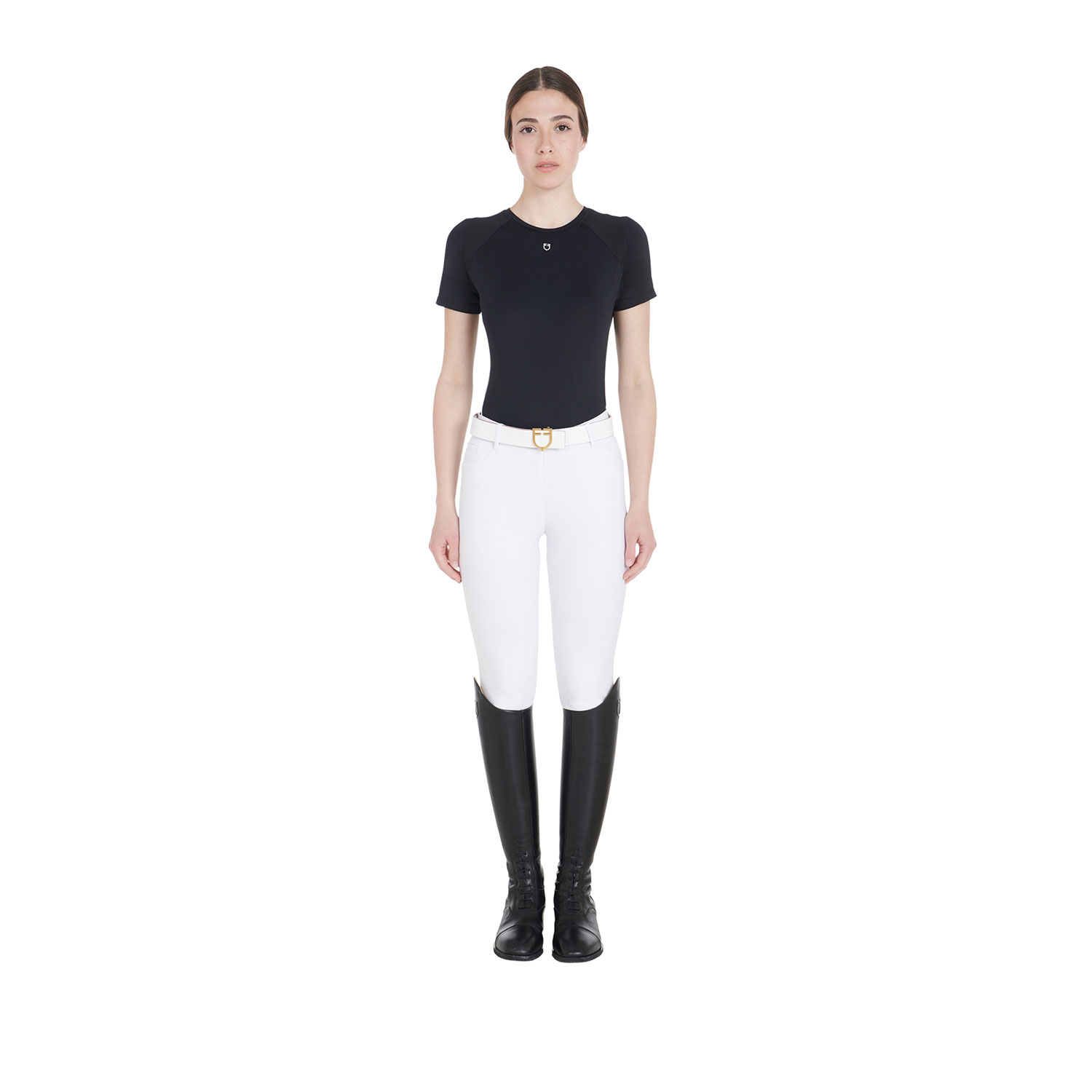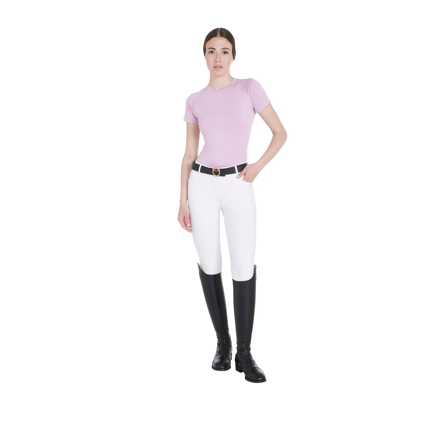T-shirt donna slim fit, in tessuto tecnico traspirante a mezza manica, è impreziosita con piping, logo del brand e scritta Equestro laterale.