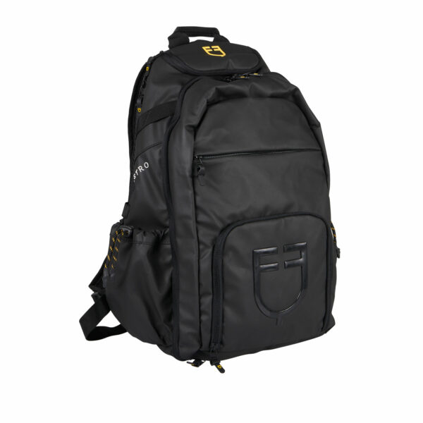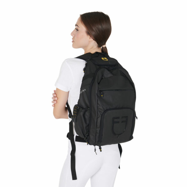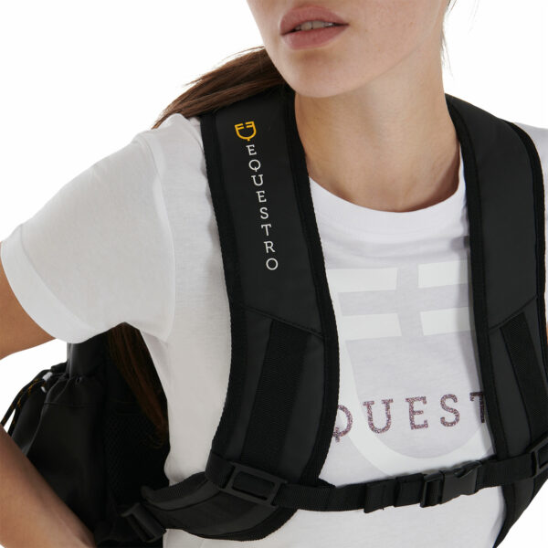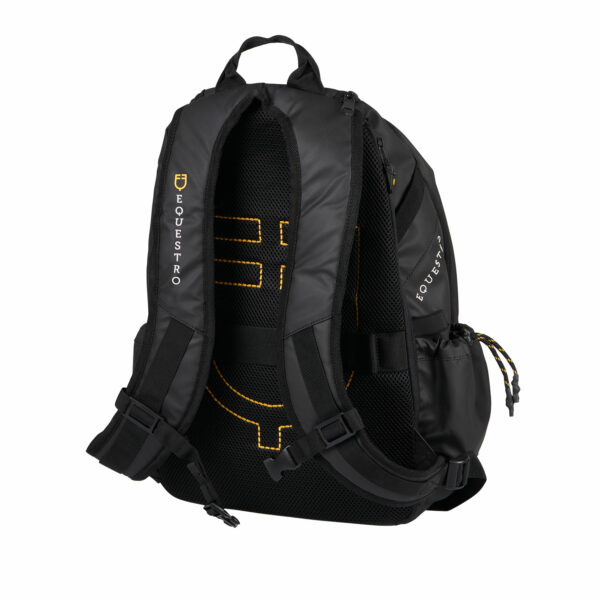 Scritta Equestro bianca stampata in 3D sul fianco destro, logo Equestro giallo stampato in 3D sulla parte superiore dello zaino e stampa 3D del logo Equestro in nero lucido sulla tasca frontale.